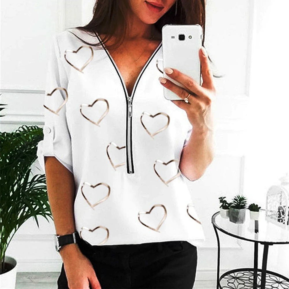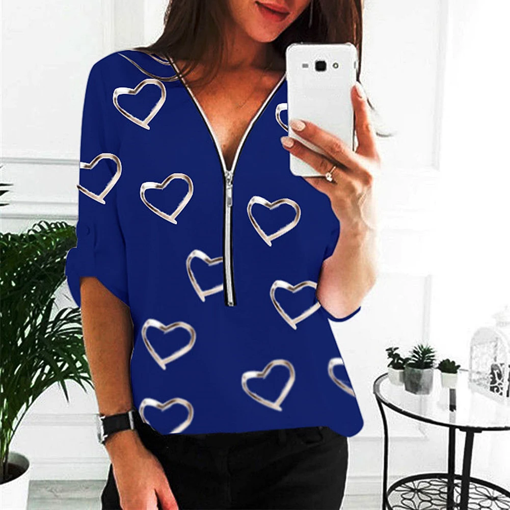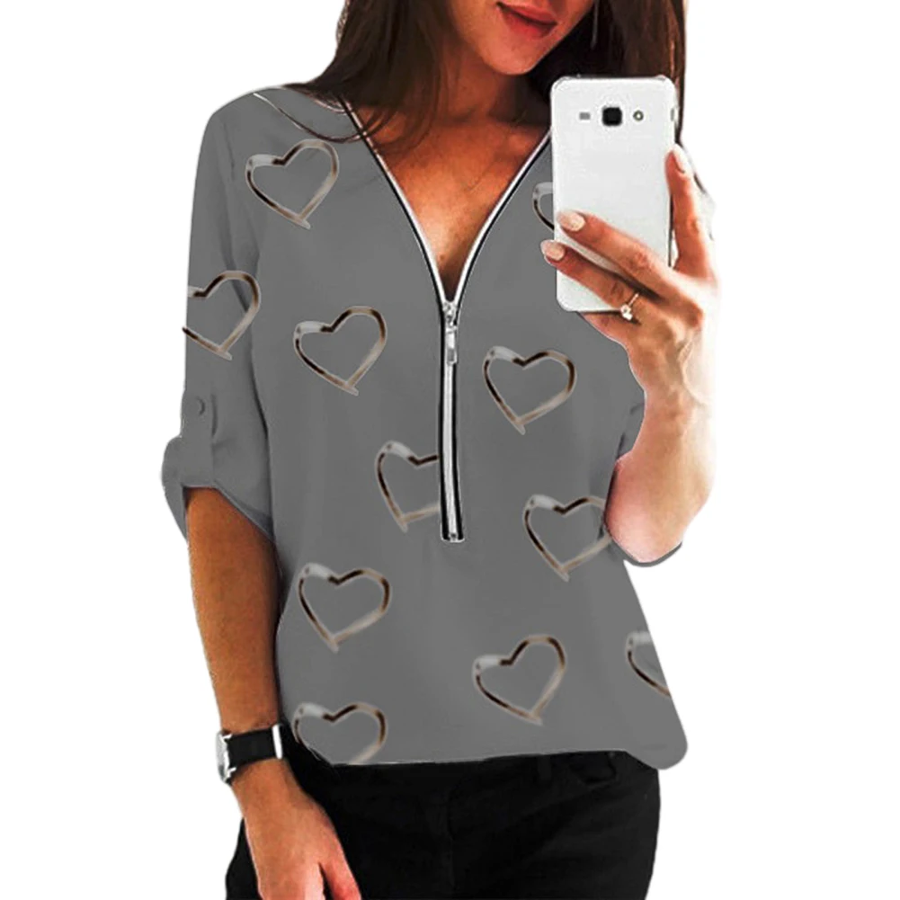 Женская модная блузка на молнии с V-образным вырезом и длинным рукавом