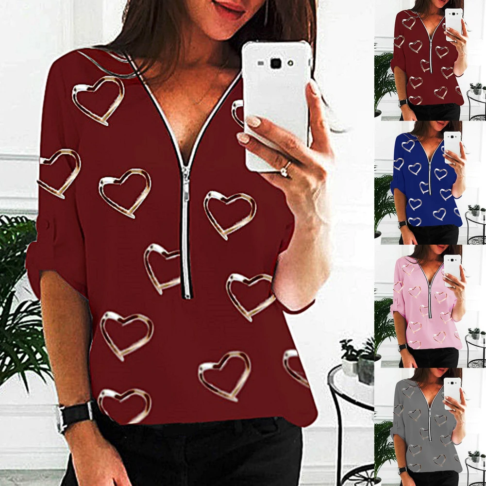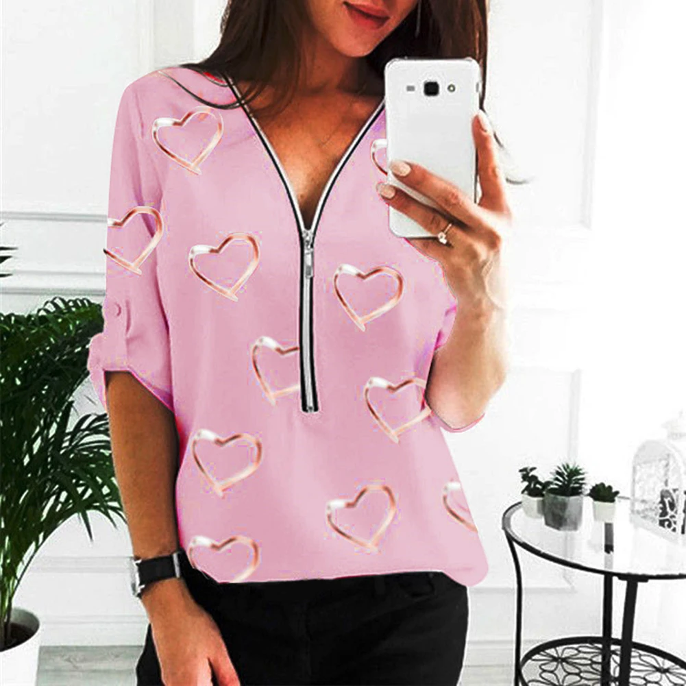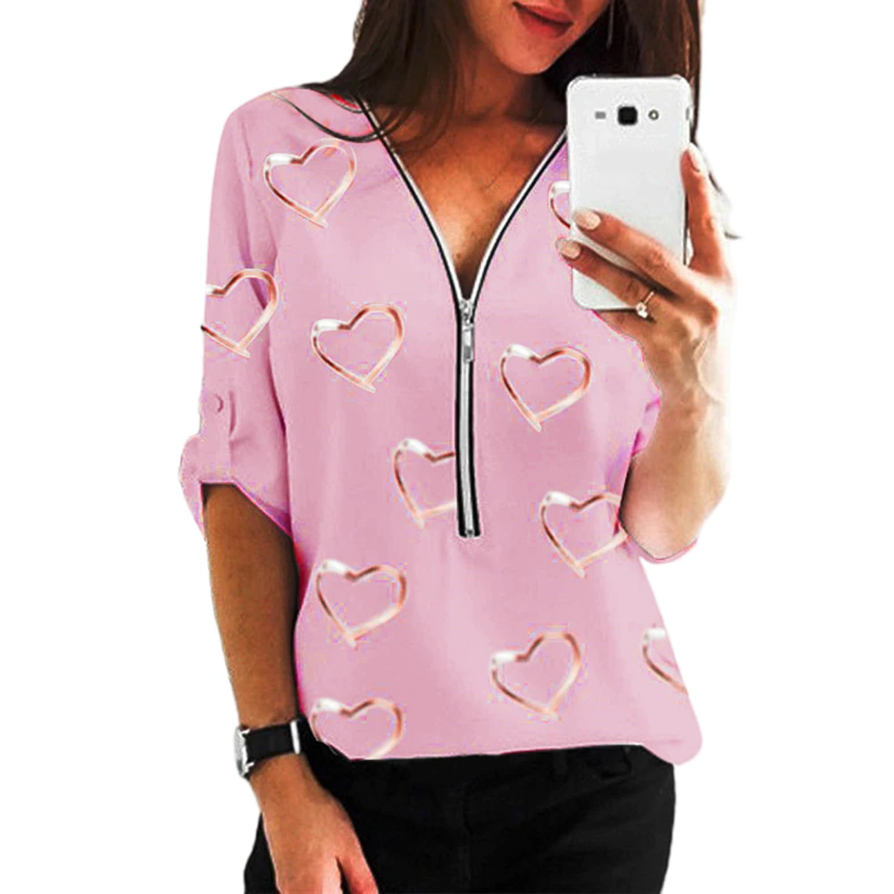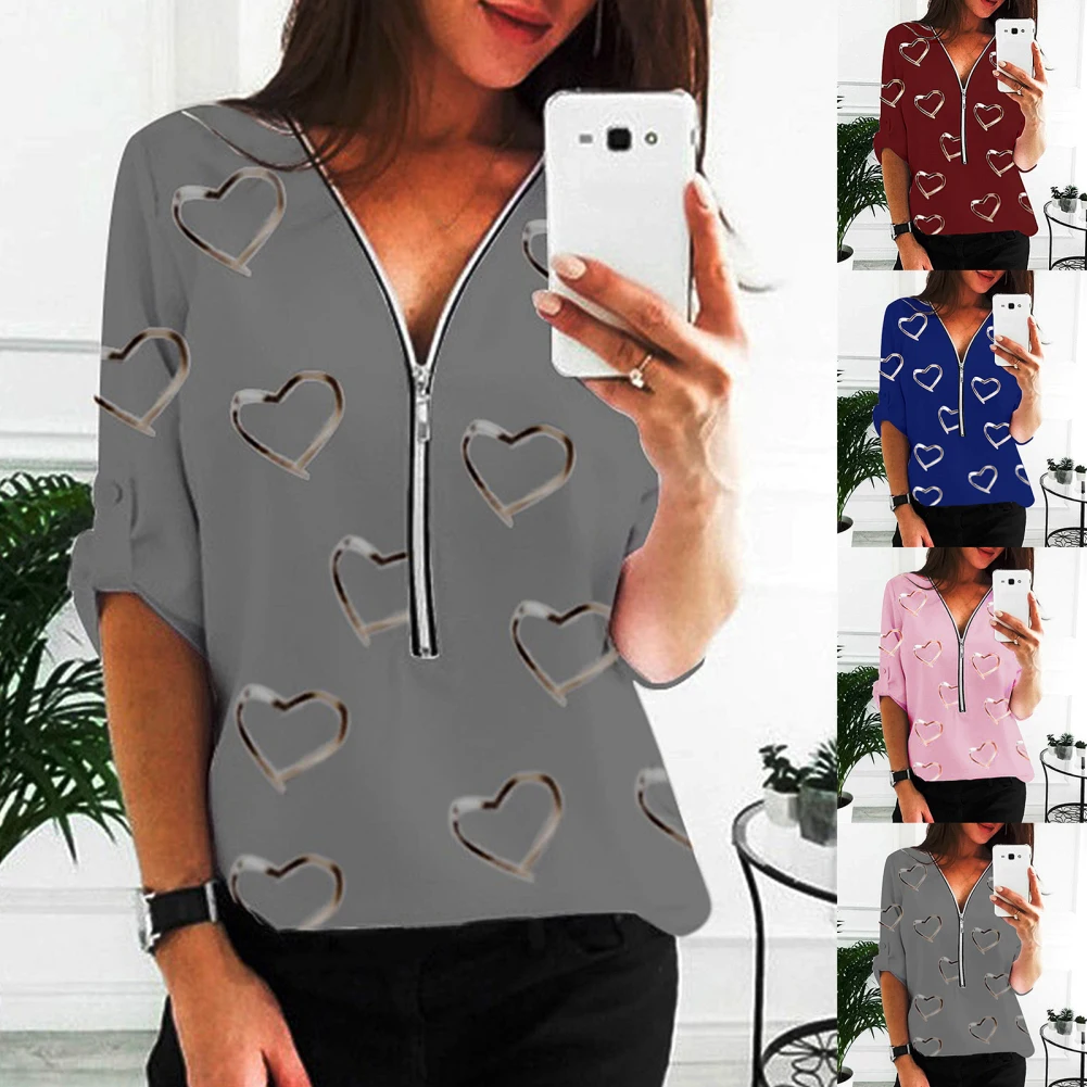 Женская модная блузка на молнии с V-образным вырезом и длинным рукавом