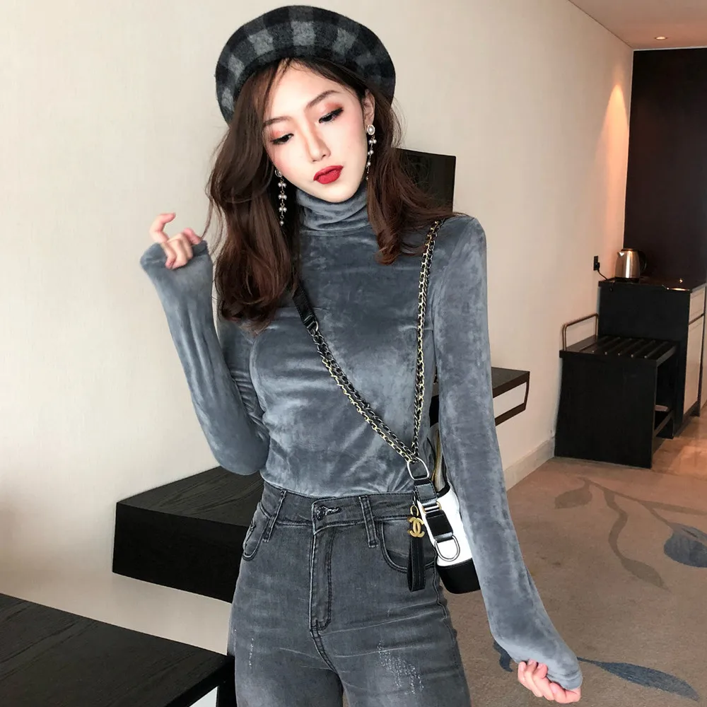 Женская футболка, теплые бархатные пуловеры, топы, зимняя теплая водолазка с длинным рукавом, футболка с высоким воротником, облегающая футболка 2020