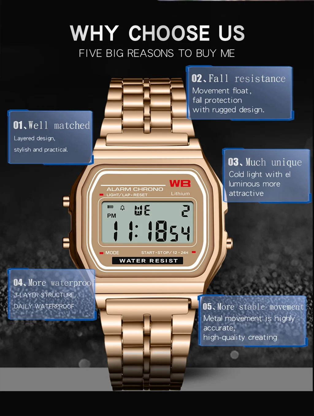 Часы наручные женские цифровые, водонепроницаемые Роскошные модные светодиодные с электронным дисплеем, календарь, будильник, цвет розовое золото, подарок для женщин