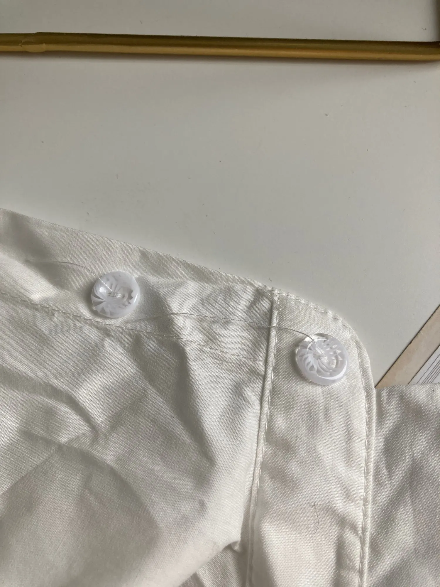 Product arrived quite crumpled but will look nice after being washed and ironed. Buttons seem to have a little flower shaped detail.