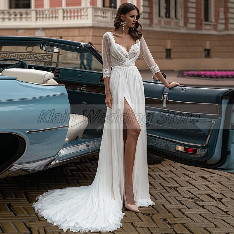 Модное шифоновое свадебное платье с разрезом в стиле бохо 2021 высококачественные свадебные платья с V-образным вырезом и коротким шлейфом с открытой спиной три четверти