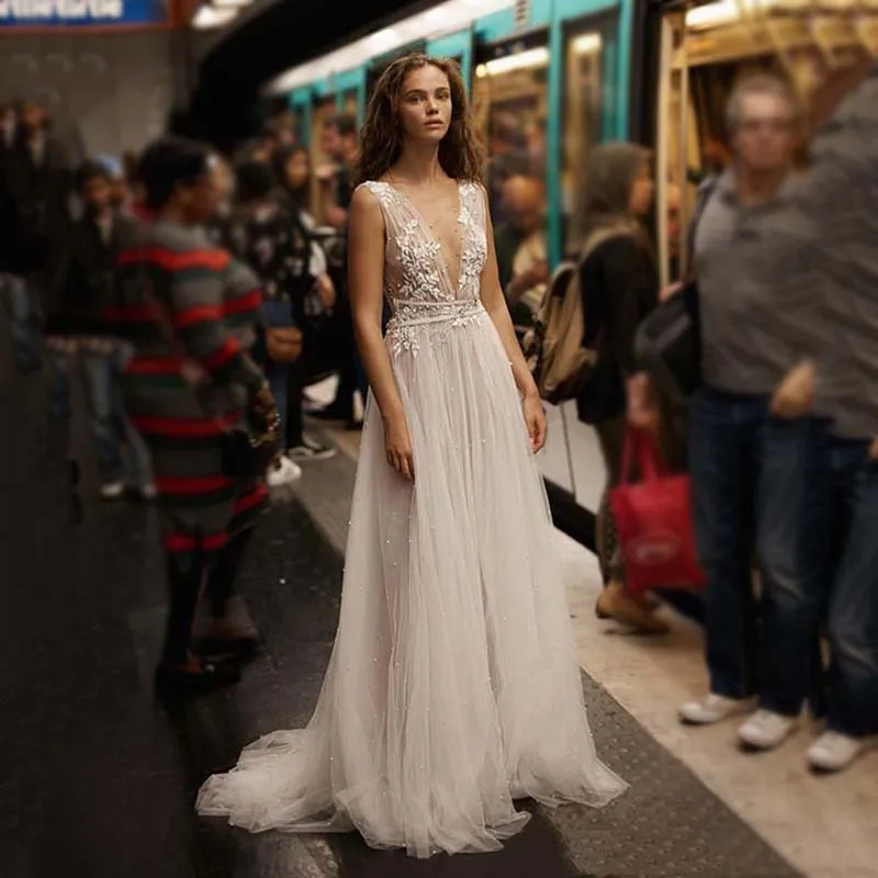 Простые свадебные платья, сексуальное свадебное платье с v-образным вырезом, бисером, кружевной аппликацией, тюль, А-линия, свадебное пляжное платье, vestidos de novia