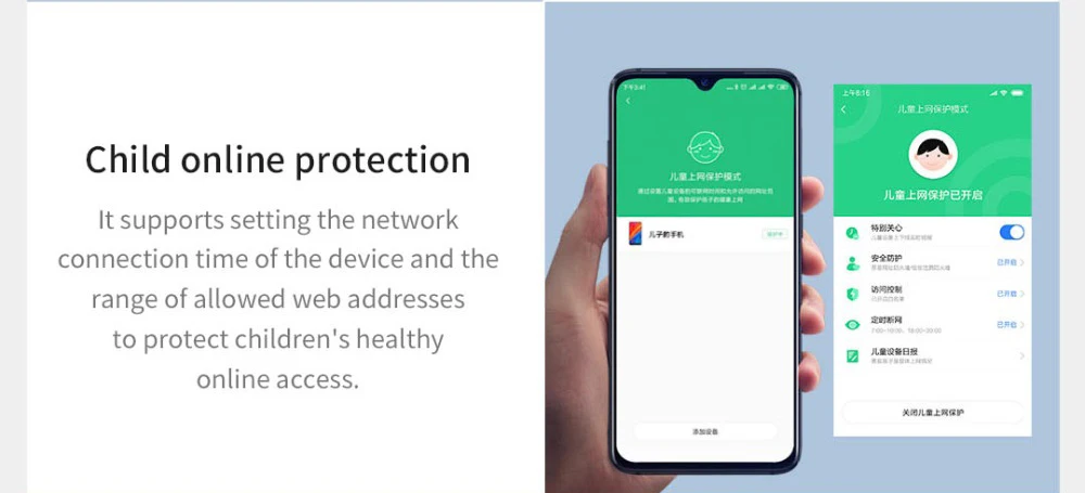 Он поддерживает настройку времени сетевого подключения устройства и диапазона разрешенных веб-адресов для защиты здорового онлайн-доступа детей.
