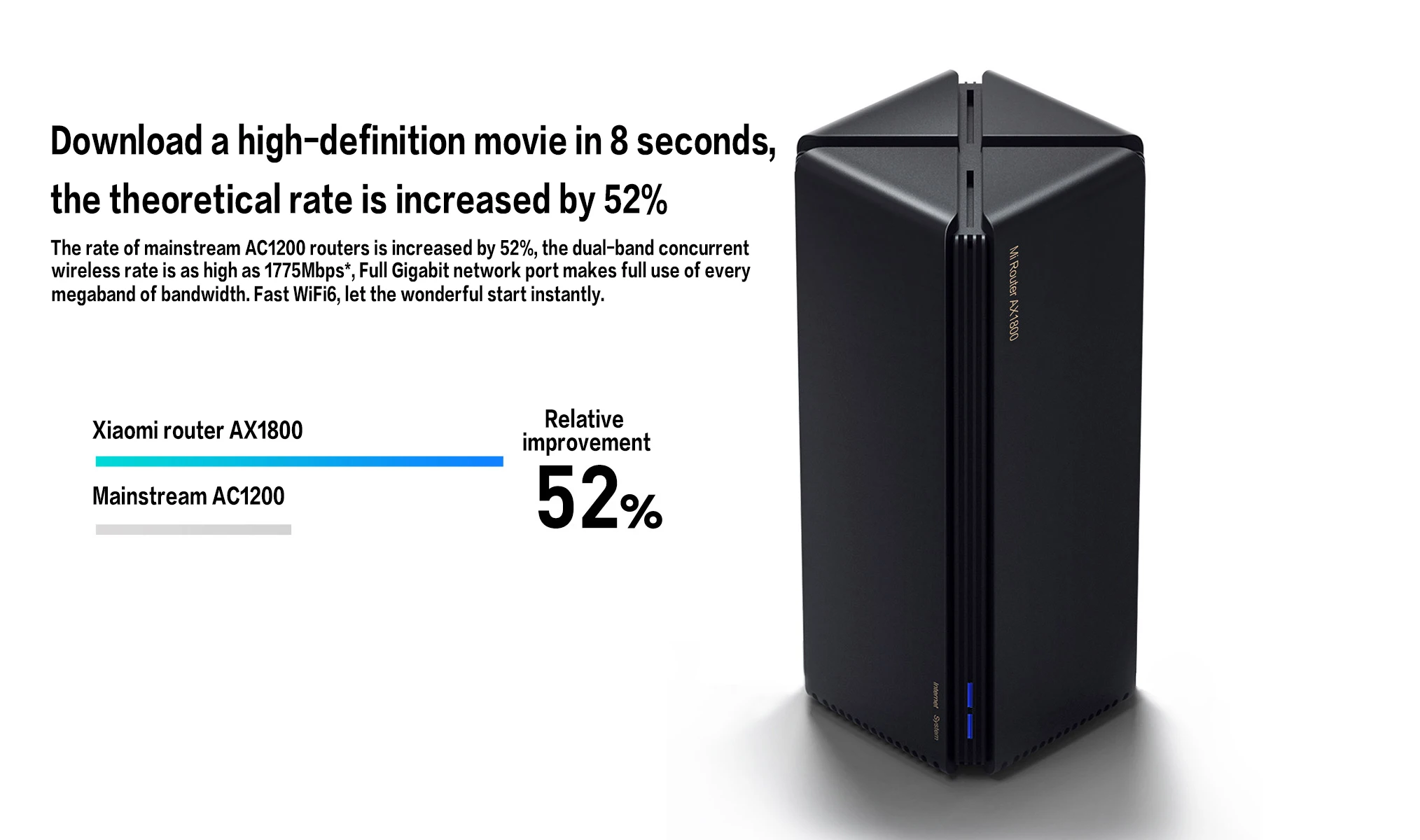 Скорость основных роутеров AC1200 увеличена на 52%, параллельная Двухдиапазонная скорость беспроводной связи достигает 1775 Мбит/с *, полный гигабитный сетевой порт в полной мере использует каждый мегабит полосы пропускания. Быстрый WiFi6, пусть замечательный старт мгновенно.