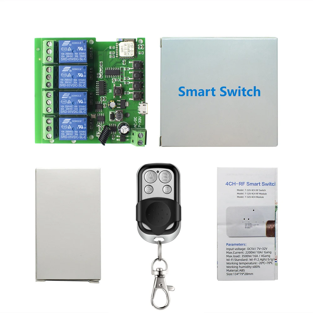 Тип 1: 4 ch DC 7V-32V (без функции RF) Wifi беспроводной модуль переключателя Тип 2: 4 ch DC7V-32V (поддержка 433 МГц) WifI RF беспроводной модуль переключателя Тип 3: 4 ch AC 85V-250V (поддержка 433Mhz ) WifI RF беспроводной модуль переключателя Тип 4: 1 ch DC 5V Wifi беспроводной модуль переключателя Тип 5: 1 ch DC 7-32V Wifi беспроводной модуль переключателя Тип 6: Радиочастотный пульт дистанционного управления 433 МГц: Тип 7: 4 ch DC7V-32V (поддержка 433 МГц) Wifi RF беспроводной модуль переключателя + пульт дистанционного управления 433 МГц Тип 8: 4 ch AV85V-250V (поддержка 433 МГц) Wifi RF беспроводной модуль переключателя + пульт дистанционного управления 433 МГц