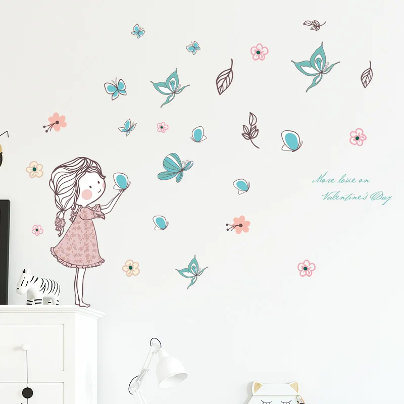 Мультяшные милые наклейки на стену для девочек, Летающие бабочки, цветы, украшения для детской комнаты, детские наклейки из ПВХ