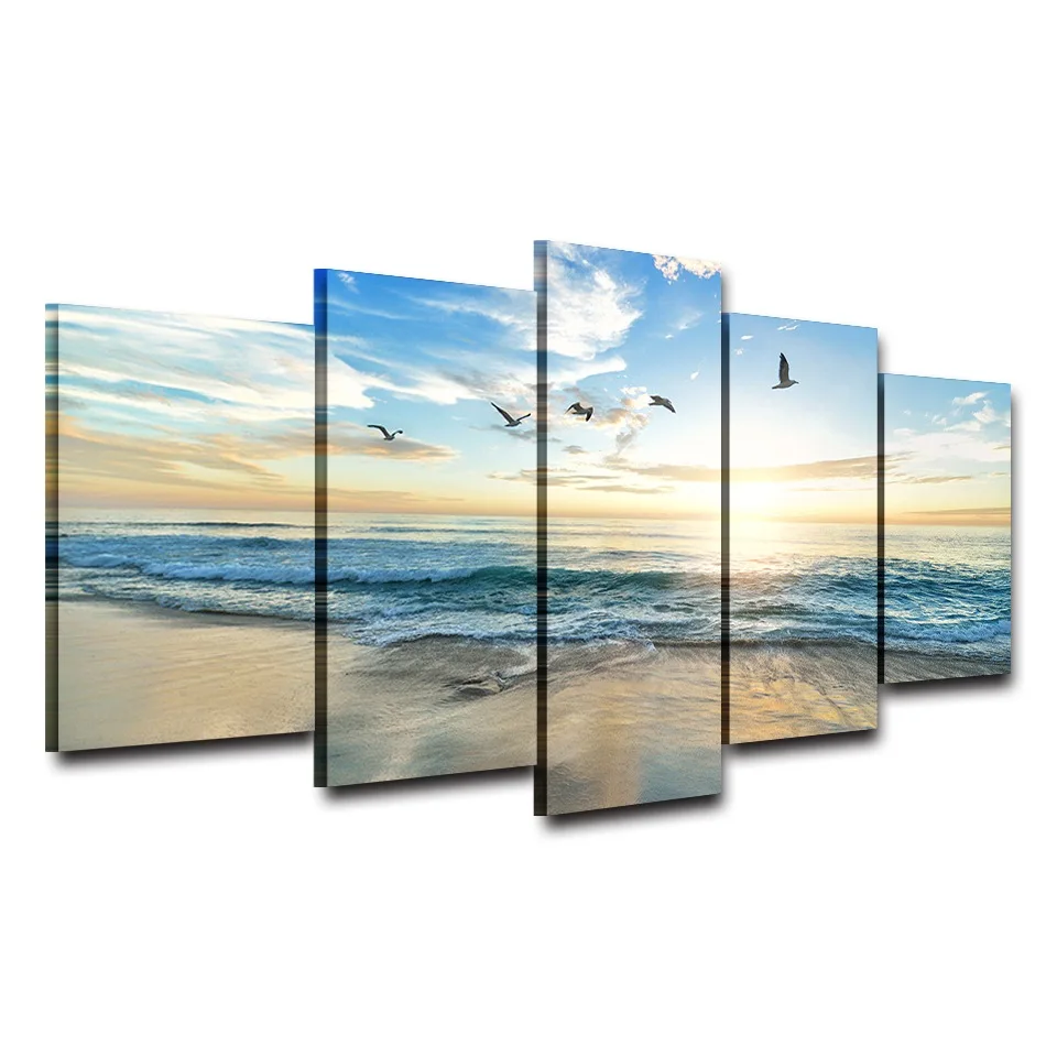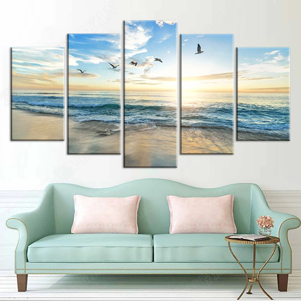 Картины на холсте с изображением морских волн, пляжа, чайки, птиц, модульные настенные картины, 5 шт.