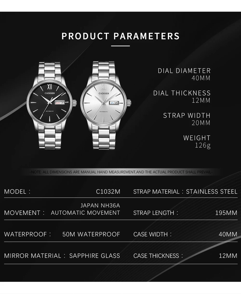 Часы наручные CADISEN Мужские автоматические, брендовые механические в японском стиле, NH36A, с датой, неделей