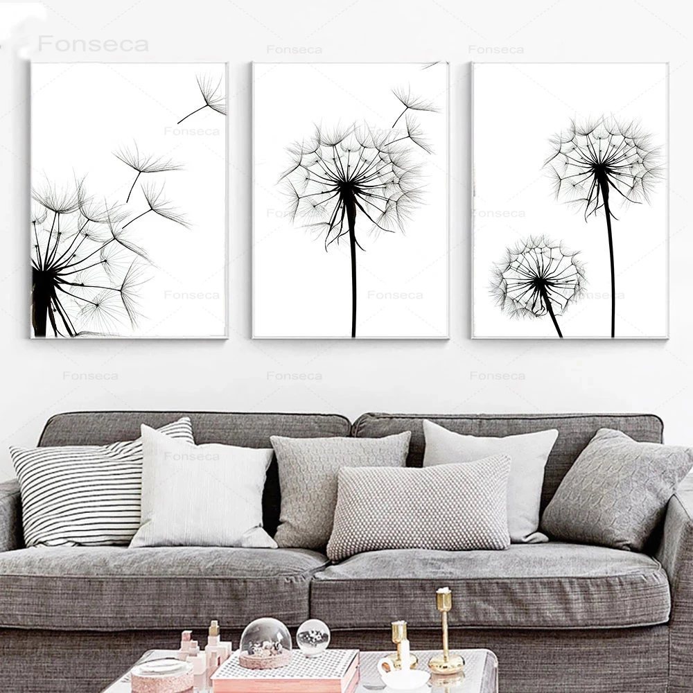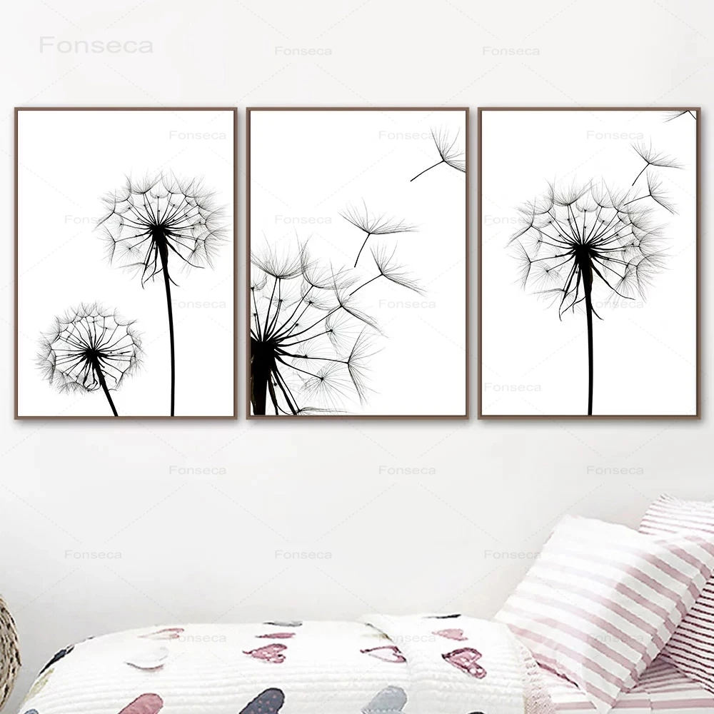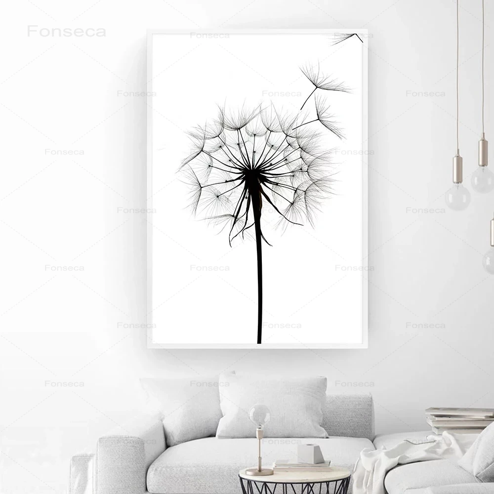 Плакат в скандинавском стиле с изображением одуванчика и цветов, минималистичный черно-белый плакат на холсте, современные настенные картины для декора гостиной