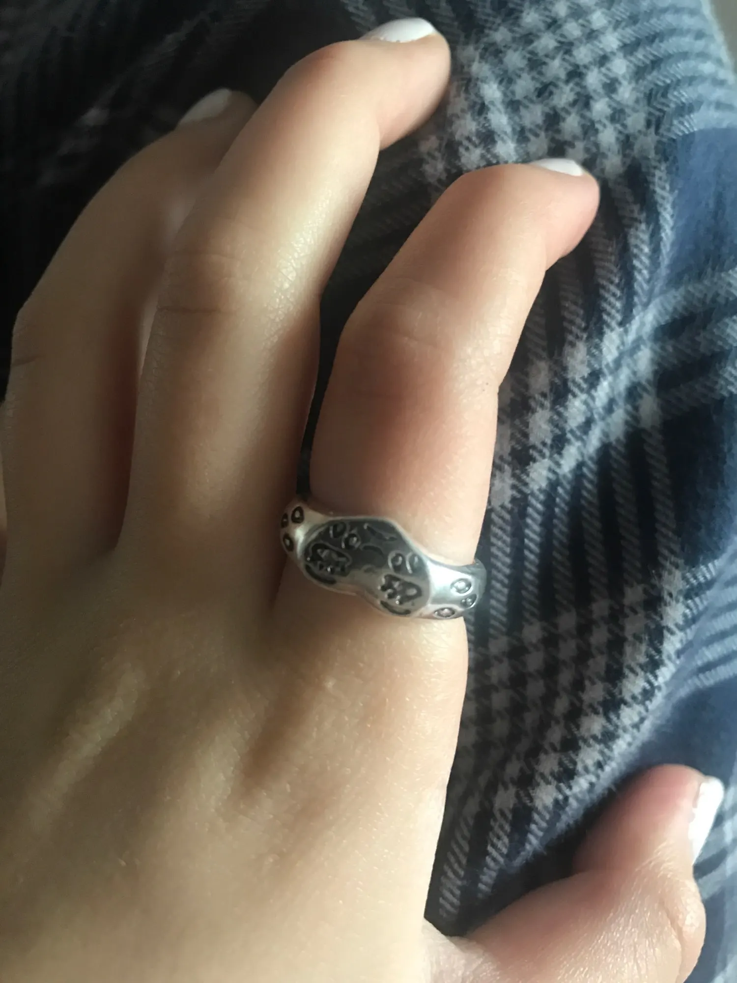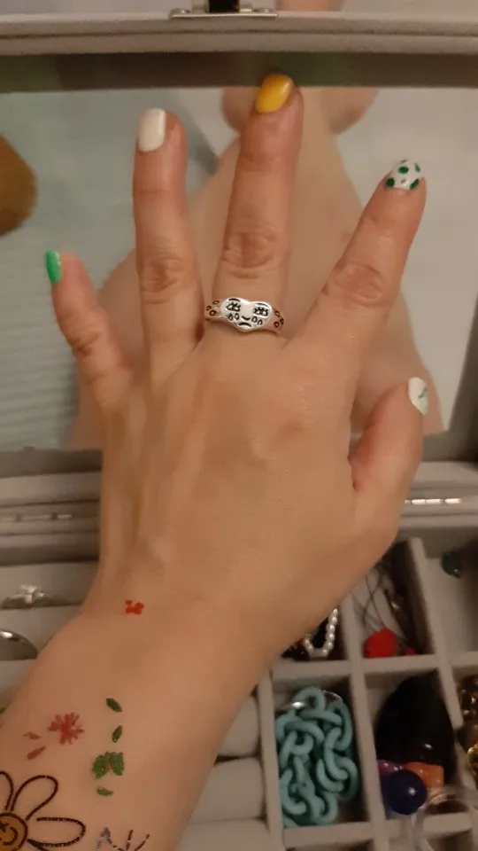 Кольцо было таким красивым и выглядит точно так же, как на картинке. Очень дешево, хотя и оставляет отметки на пальцах.