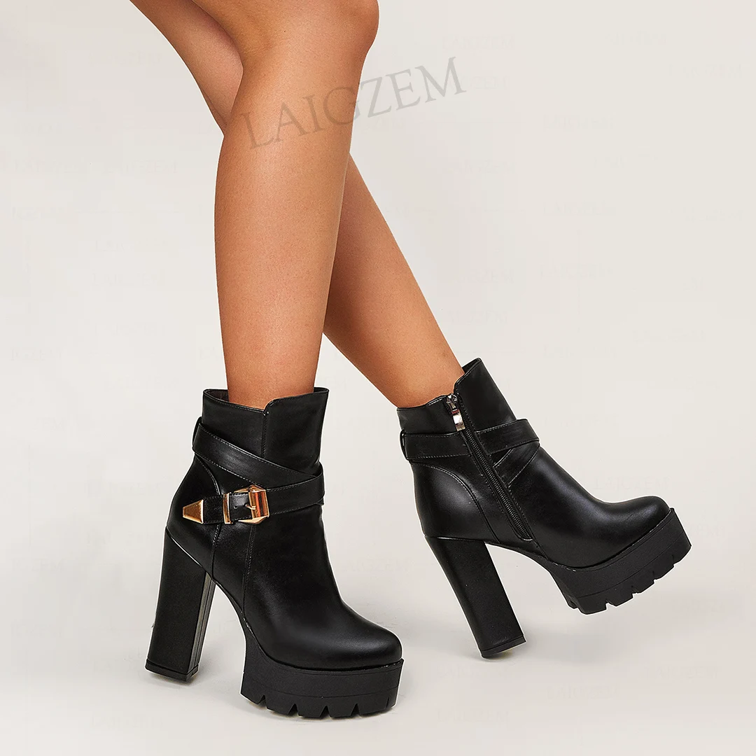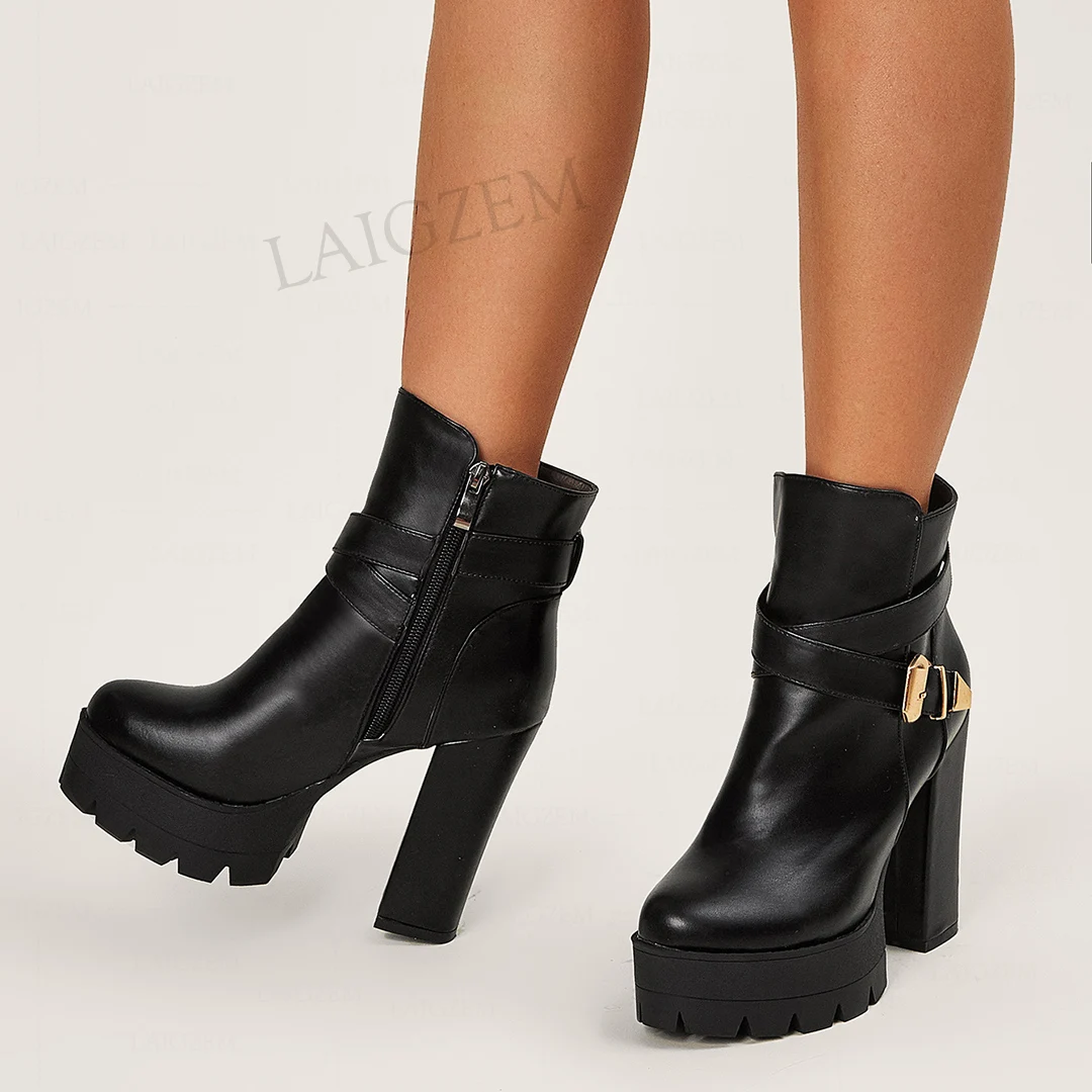 SEIIHEM/женские ботильоны на платформе с круглым носком; Ботинки на Высоком толстом каблуке; Женская обувь из искусственной кожи черного цвета; Размеры 36, 37, 38, 42, 43