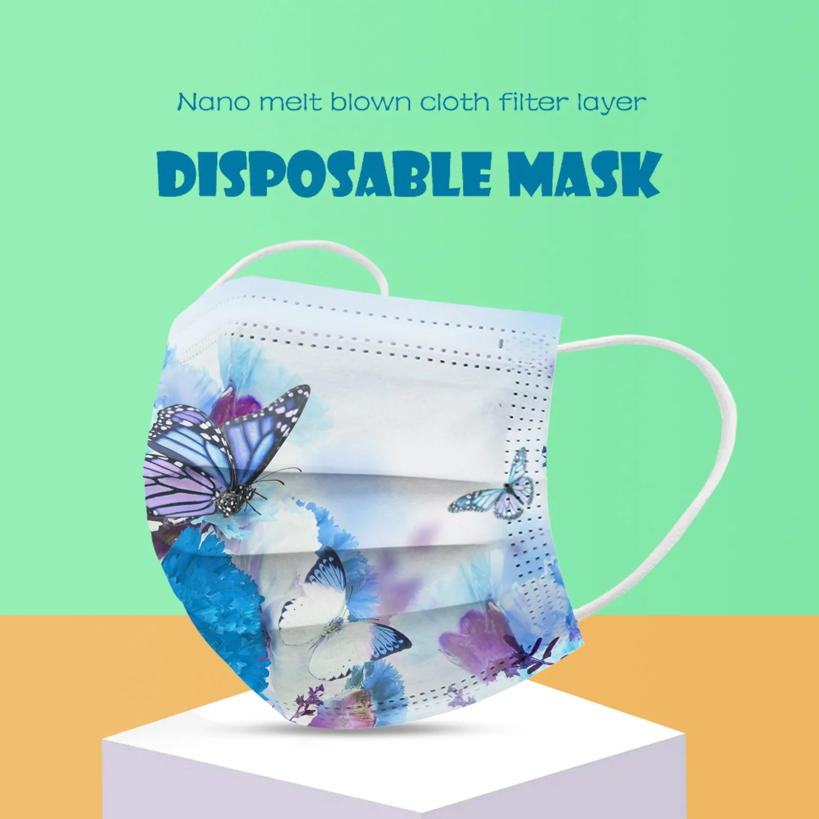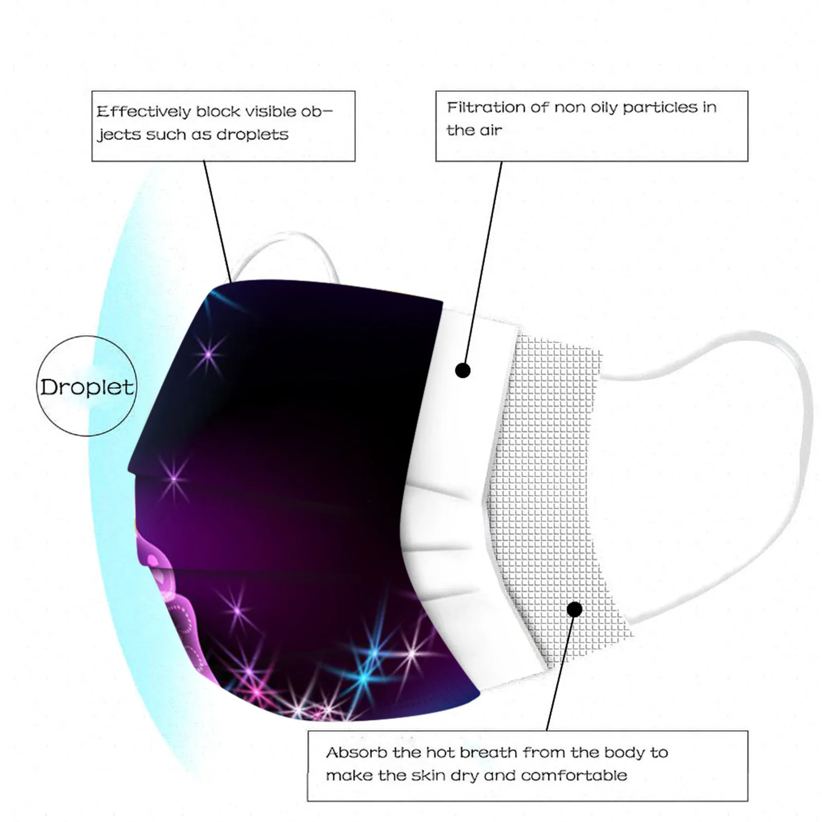 Одноразовая маска изготовлена из 3-слойного нетканого материала Безопасен для здоровья и использования. Дышащий и красивый материал Узоры, что делает его полезным и модным. Специальный 3-слойный нетканый Дизайн, обеспечивает некоторую защиту от пыли, выхлопных газов автомобиля, Эластичная петля для ушей, легко надевается и не давит на уши.