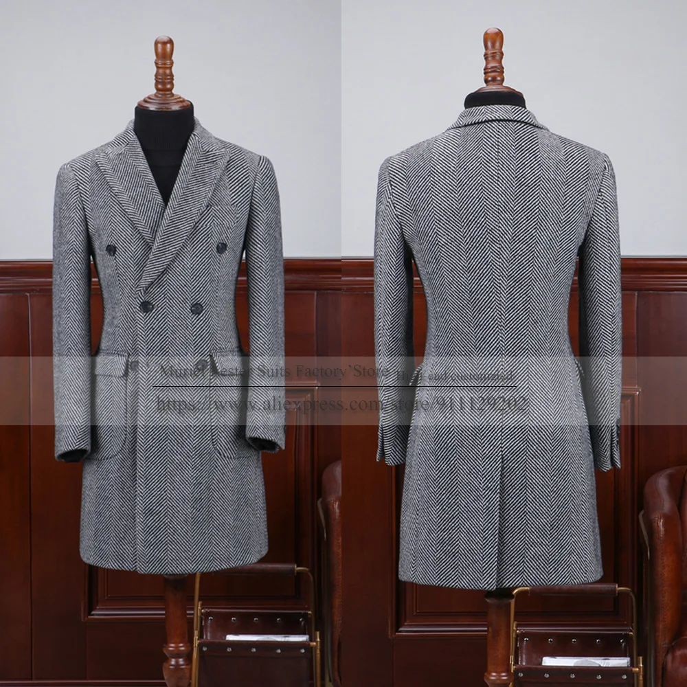 Зимние серые мужские костюмы в елочку, куртка, двубортное пальто на заказ, длинное пальто с отложным воротником, блейзер для жениха, повседневный смокинг