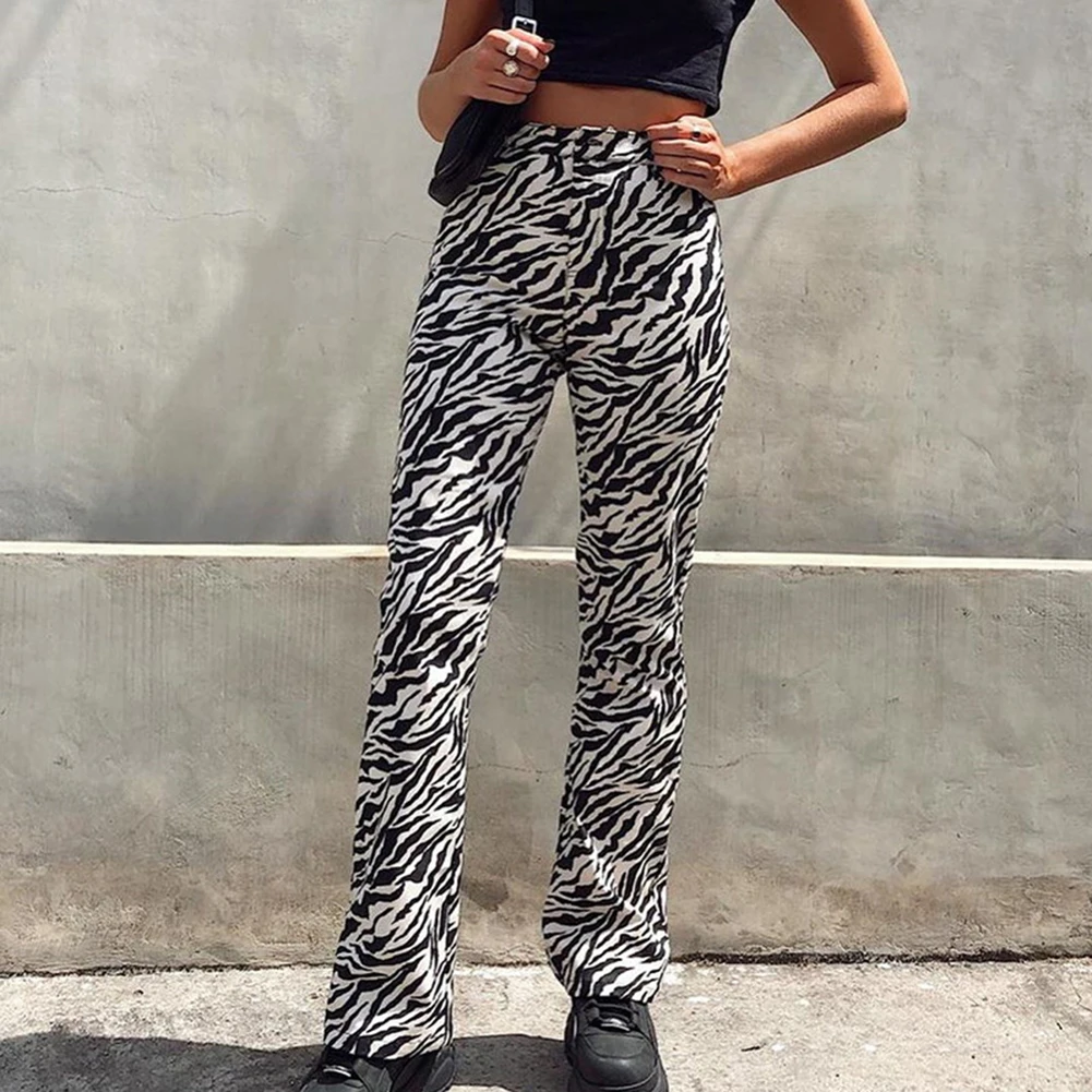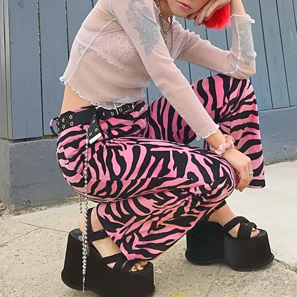 Брюки-клеш Женские с завышенной талией, повседневные Прямые длинные штаны с принтом зебры, модные розовые Джоггеры в стиле Харадзюку