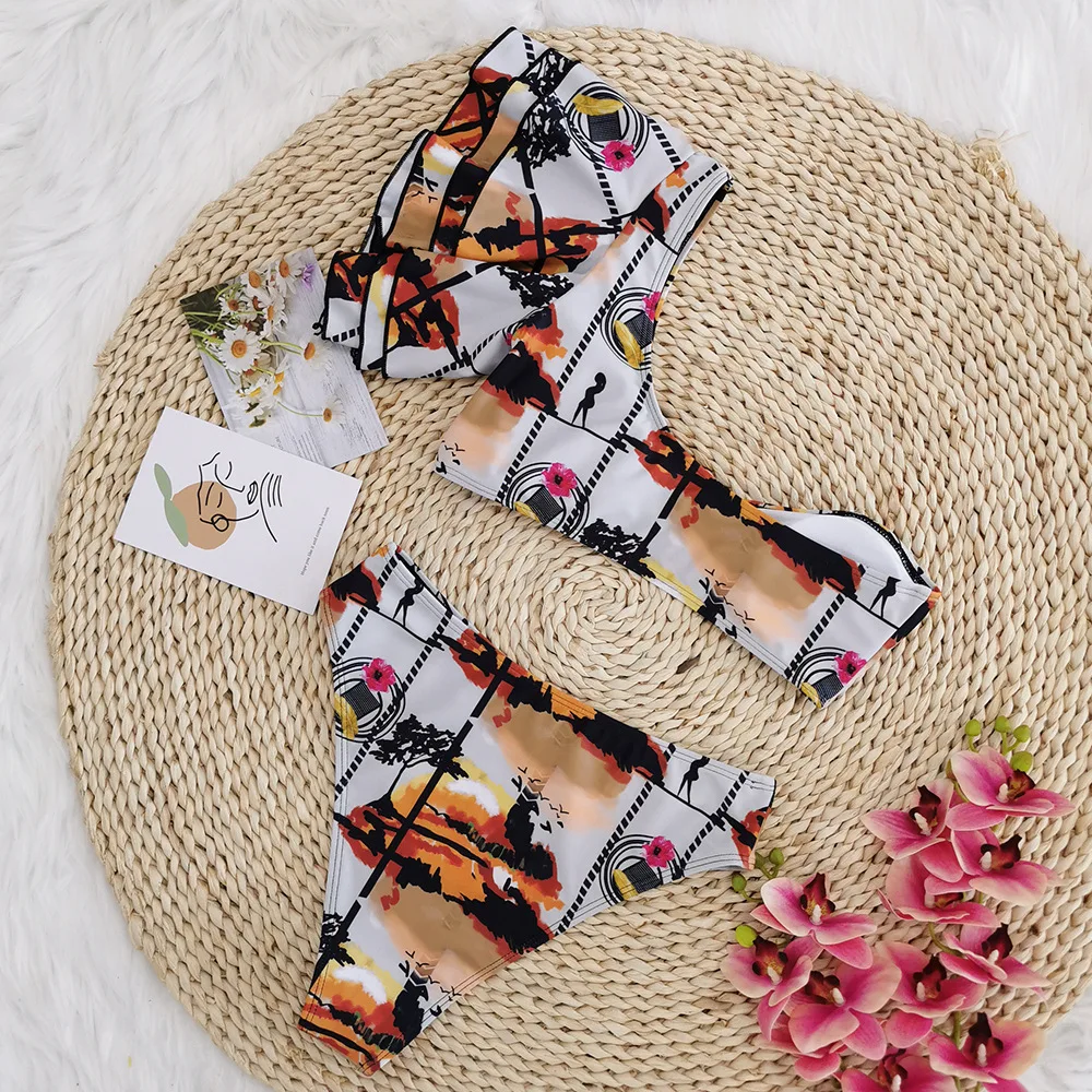 Комплект бикини женский с цветочным принтом, купальный костюм с чашками пуш-ап, бюстгальтер с оборками, бандажный купальный костюм, пляжная одежда, 2021