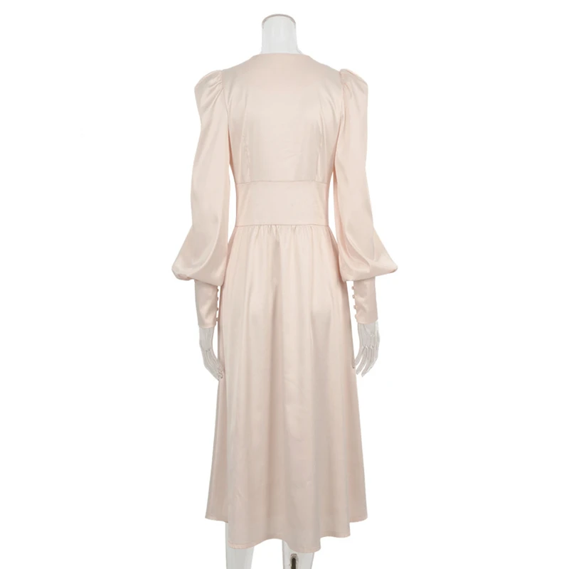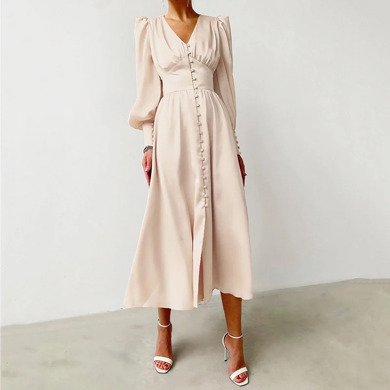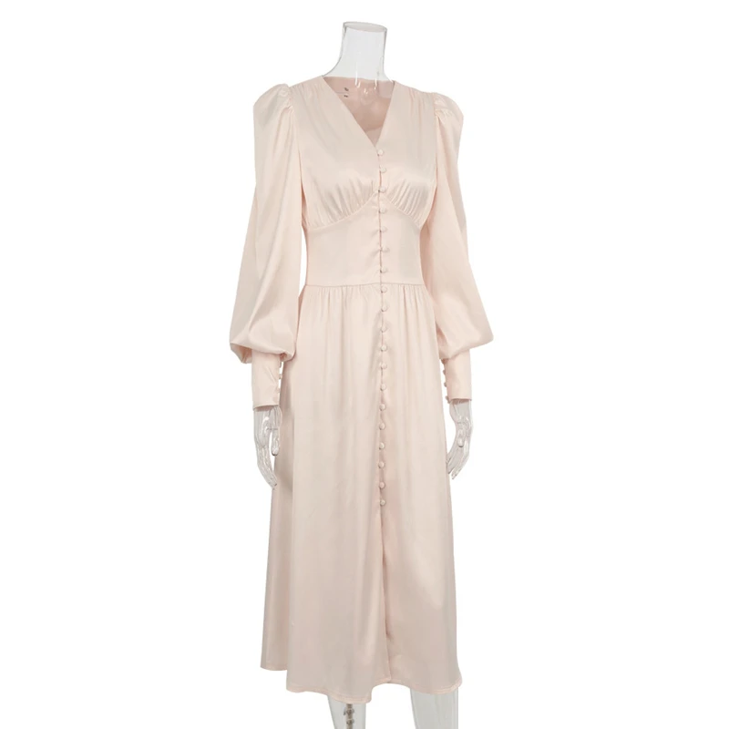 Женское винтажное атласное платье, элегантное однотонное длинное платье-трапеция макси с глубоким V-образным вырезом, пышными рукавами и пуговицами, весна