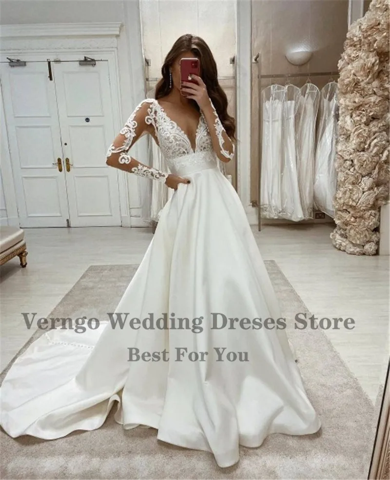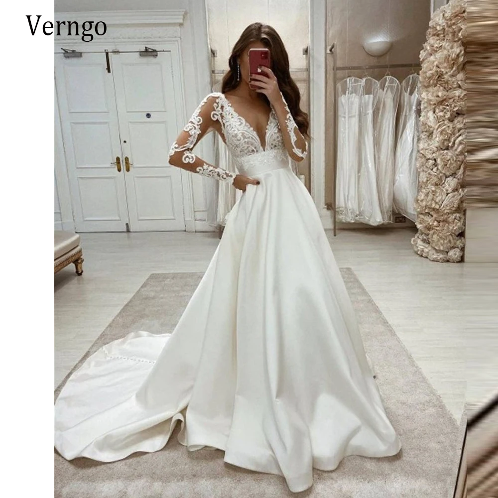 Винтажное кружевное и Атласное Свадебное Платье-трапеция Verngo 2021, платья невесты с длинными рукавами, V-образным вырезом, аппликацией и прозрачными пуговицами, со шлейфом