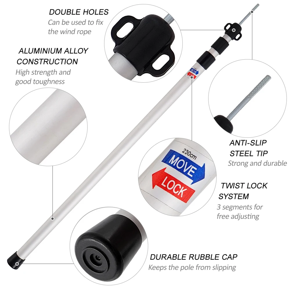 Высота шатра может быть отрегулирована для различных случаев и потребностей. Каждый столб секции тщательно обрабатываются для плавного соединения для вашего действительно быстрого настройки/снятия.Особенности:2 шт. штанги, каждый стержень включает 3 сегмента.Устойчивая к коррозии конструкция из алюминиевого сплава, высокая прочность и хорошая прочность.Телескопическая конструкция позволяет регулировать высоту от 35,4 ''-90,6''.Двойные отверстия на головке полюса могут быть использованы для фиксации ветровой веревки.Прочный щебень в нижней части удерживает полюс от скольжения.Поставляется с прочным чехлом для переноски (Примечание: только 2 шт. поставляются с мешком carray, 1 шт. не входят в комплект).Каждая секция полюса тщательно обрабатывается для плавного соединения для вашей действительно быстрой установки/снятия.Идеальный аксессуар для кемпинга, альпинизма, походов, путешествий, пикника, гамака, укрытия или навеса.Характеристики:Материал: алюминиевый сплавЦвет: красный/черный/серебристый (опционально)Количество: 1 шт/2 шт (опционально)Длина: 230 см/250 см (опционально)230 смРазмер изделия: 90 - 230 см/35,4-90,6 дюймаСегмент: 3Внешний Диаметр: 29 мм/1,14 в, 25,5 мм/1,00 в, 22,2 мм/0,87 вУпаковка Размеры: 90*3 см/35,4*1,2 вПосылка Вес: 1,2 кг/2,6 фунтов лёгкий нейлоновый трос250 смРазмер изделия: 85 - 250 см/33,5-98,4 дюймаСегмент: 4Внешний Диаметр: 19 мм/0,7 в, 22,5 мм/0,9 в, 25,5 мм/1,0 В, 30 мм/1,2 вУпаковка Размеры: 97*9,5 см/38,2*3,7 вПосылка Вес: 1,32 кг/2,9 фунтов лёгкий нейлоновый тросПосылка:1 / 2 * палаточный столб