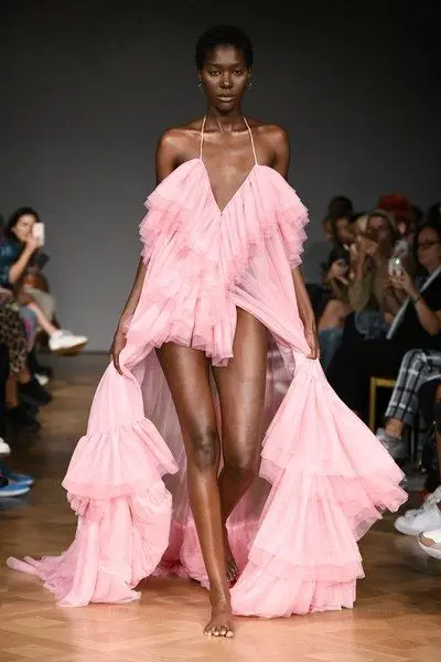 Новейшее красивое розовое платье с высокой и низкой оборкой фатинов...