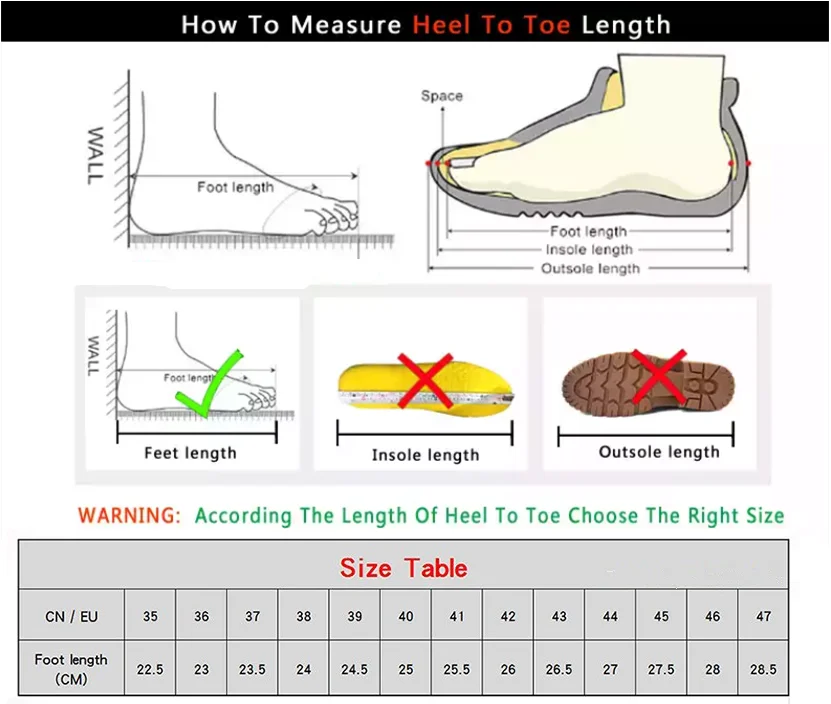 1: Пожалуйста, выберите размер в соответствии с длиной Вашей стопы 2: стандарты размеров из разных стран и разных производителей отличаются, длина вашей стопы является единственным критерием для выбора размера! 3: длина стопы-это не длина стельки, а внутренняя длина обуви, как правило, внутренняя длина> длина стопы 4: пожалуйста, тщательно Измерьте длину вашей стопы, метод показан на фотографиях ниже.