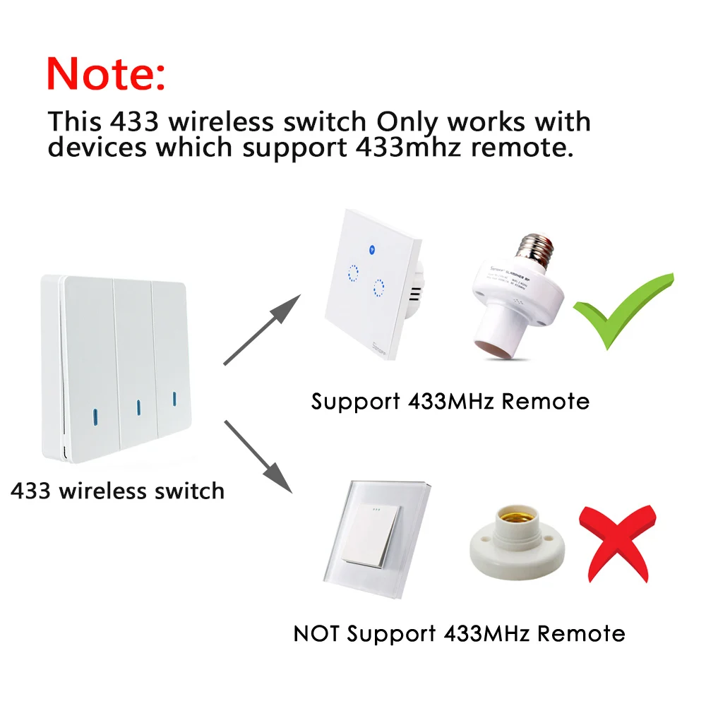 Этот переключатель представляет собой пульт дистанционного управления 433,92 МГц, а не переключатель Wi-Fi. Работает только при подключении к устройствам с поддержкой пульта дистанционного управления 433 МГц. Электронный чип этого коммутатора-это код обучения 1527, а не код копирования. Может быть сопряжен с большинством устройств 433 с модулем кода обучения 1527.