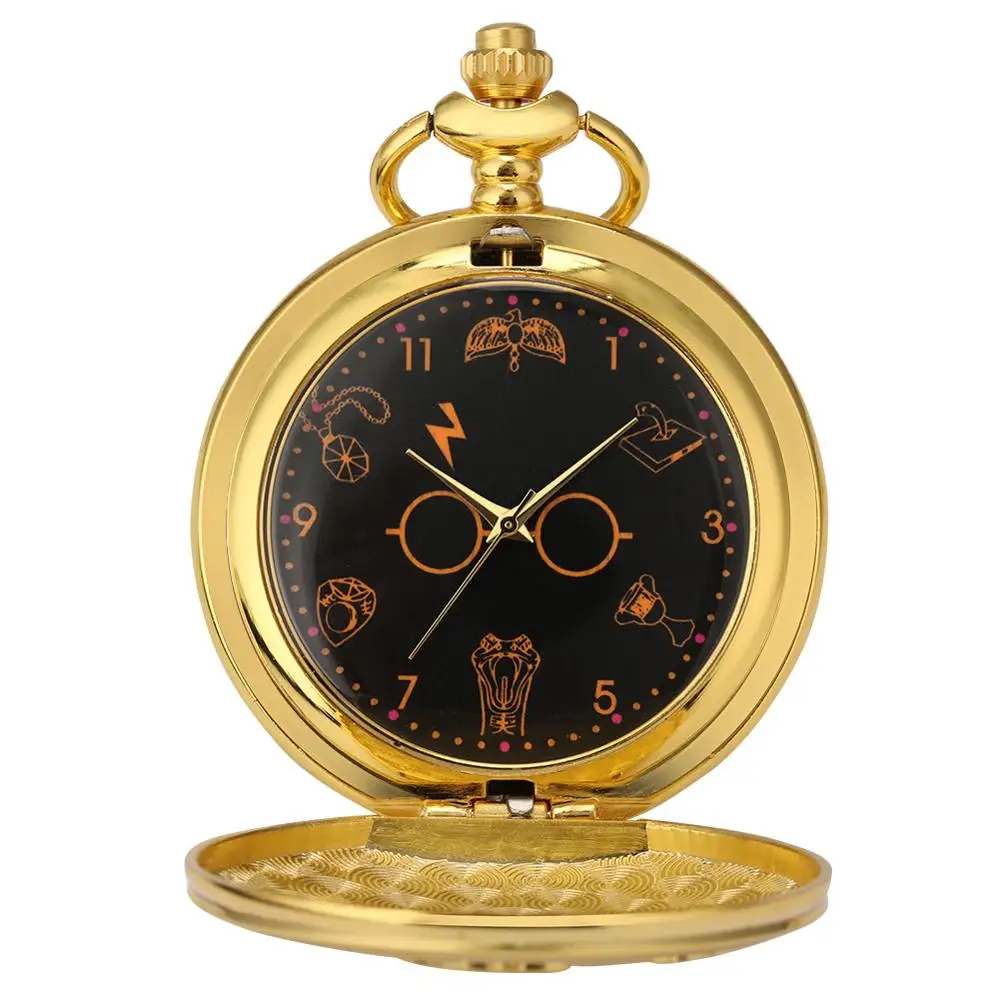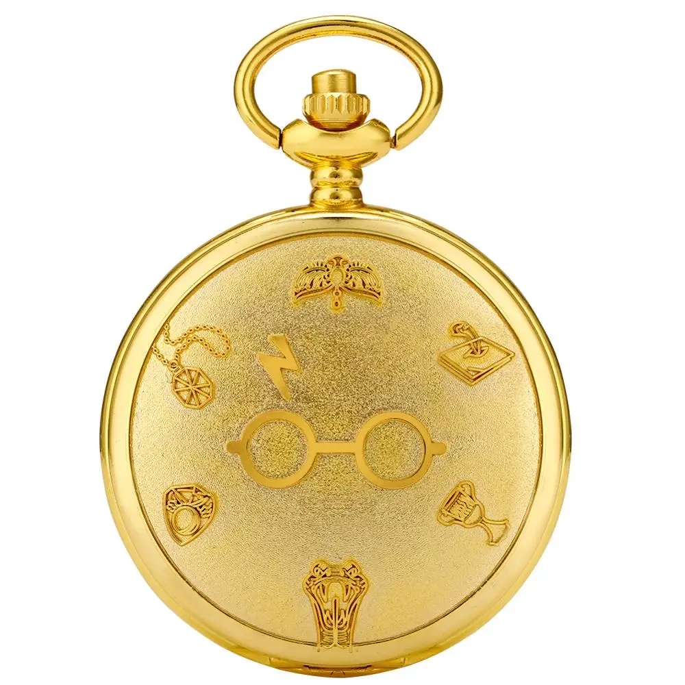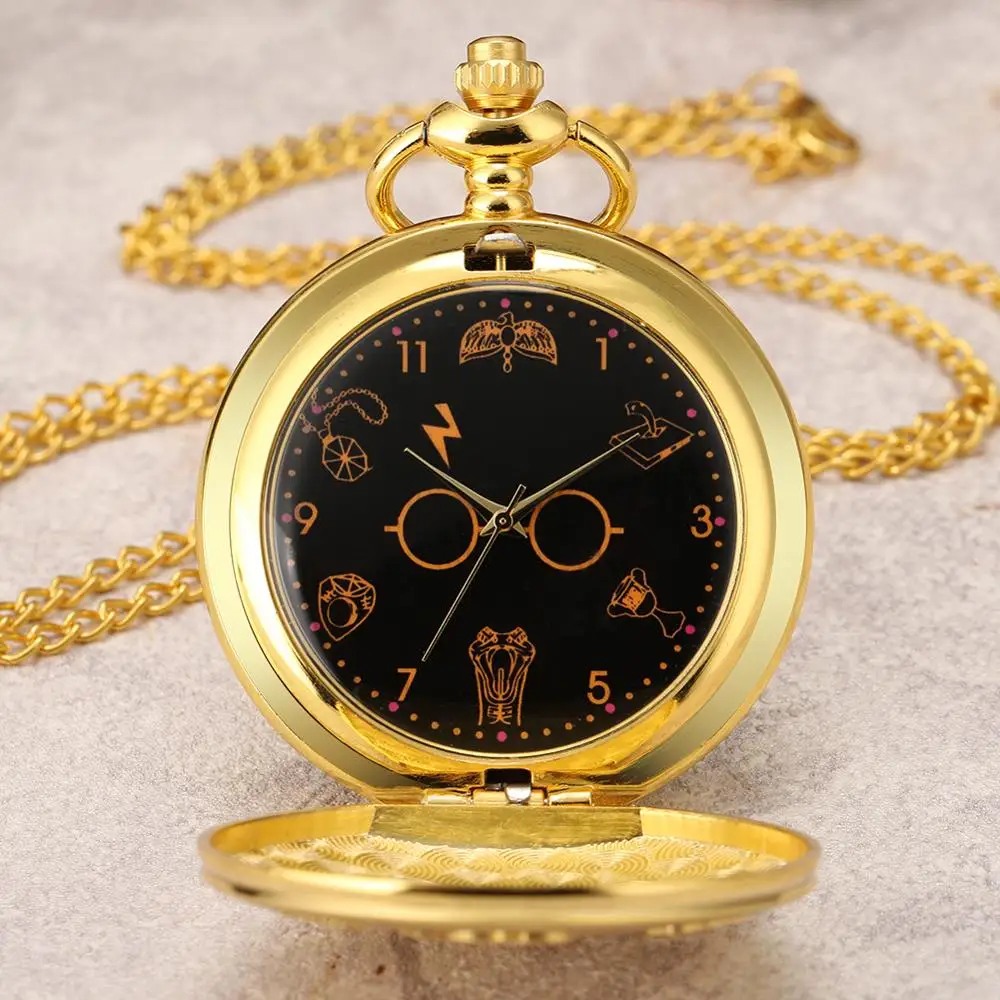 Золотые кварцевые карманные часы для мужчин, милые классические черные часы с рисунком очков, женские карманные часы, прочные тонкие подарки с подвеской