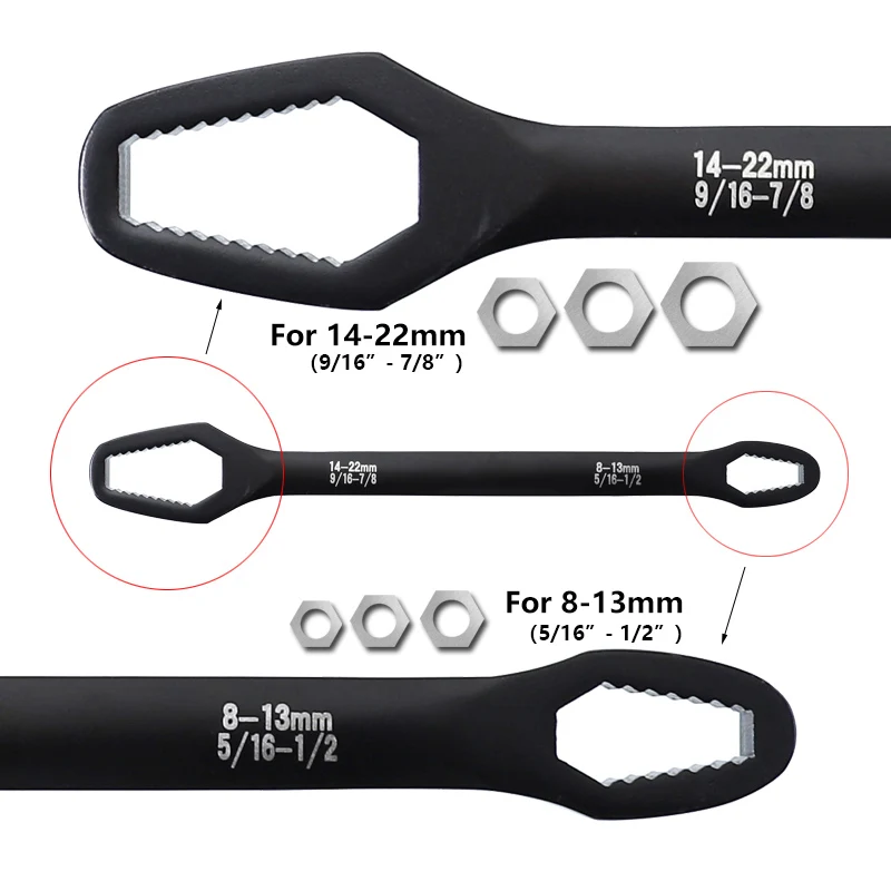 Универсальный гаечный ключ подходит для различных связанных ремонтных отраслей, таких как автомобили/механические/велосипеды/ремонт и т. Д. Длина: 270 мм Толщина: 7 мм Диапазон челюсти: 8-13 мм 14-22 мм