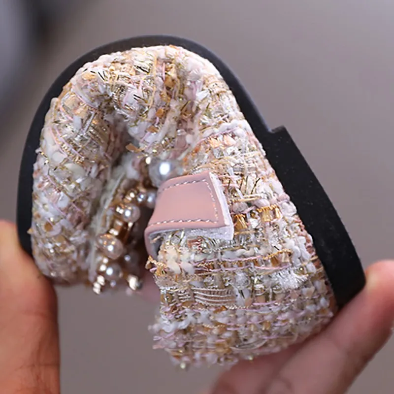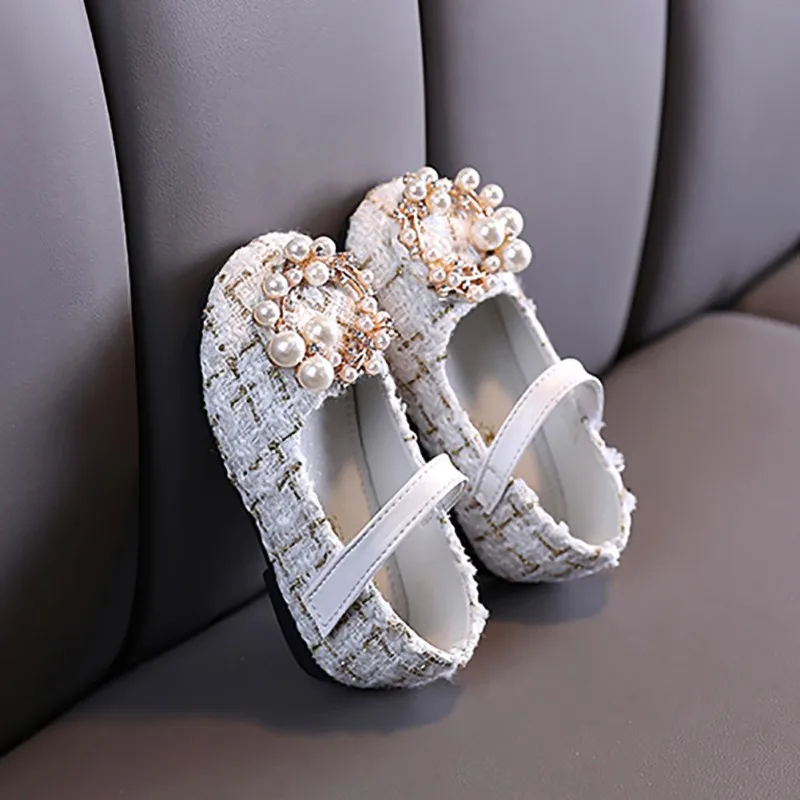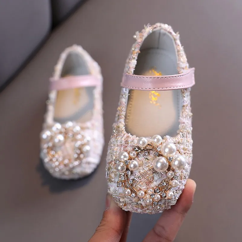 Детские туфли принцессы с жемчужинами и кристаллами; Новинка 2021 года; Свадебное платье; Нескользящие туфли из искусственной кожи на плоской подошве для детей