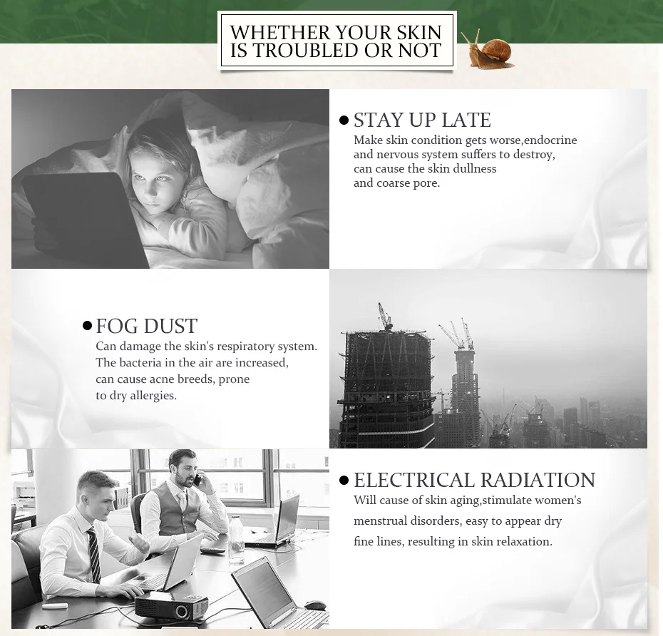 ●Не вставайте допоздна: ухудшите состояние кожи, эндокринная и нервная системы разрушаются, это может привести к тусклости кожи и крупной поре. ●Противотуманная пыль: может повредить дыхательную систему кожи. Бактерии в воздухе увеличиваются, могут вызвать акне породы, пронето сухой аллергии. ●Электрическое излучение: вызывает старение кожи, стимулирует менструальные расстройства у женщин, легко появляются сухие тонкие линии, что приводит к расслаблению кожи.