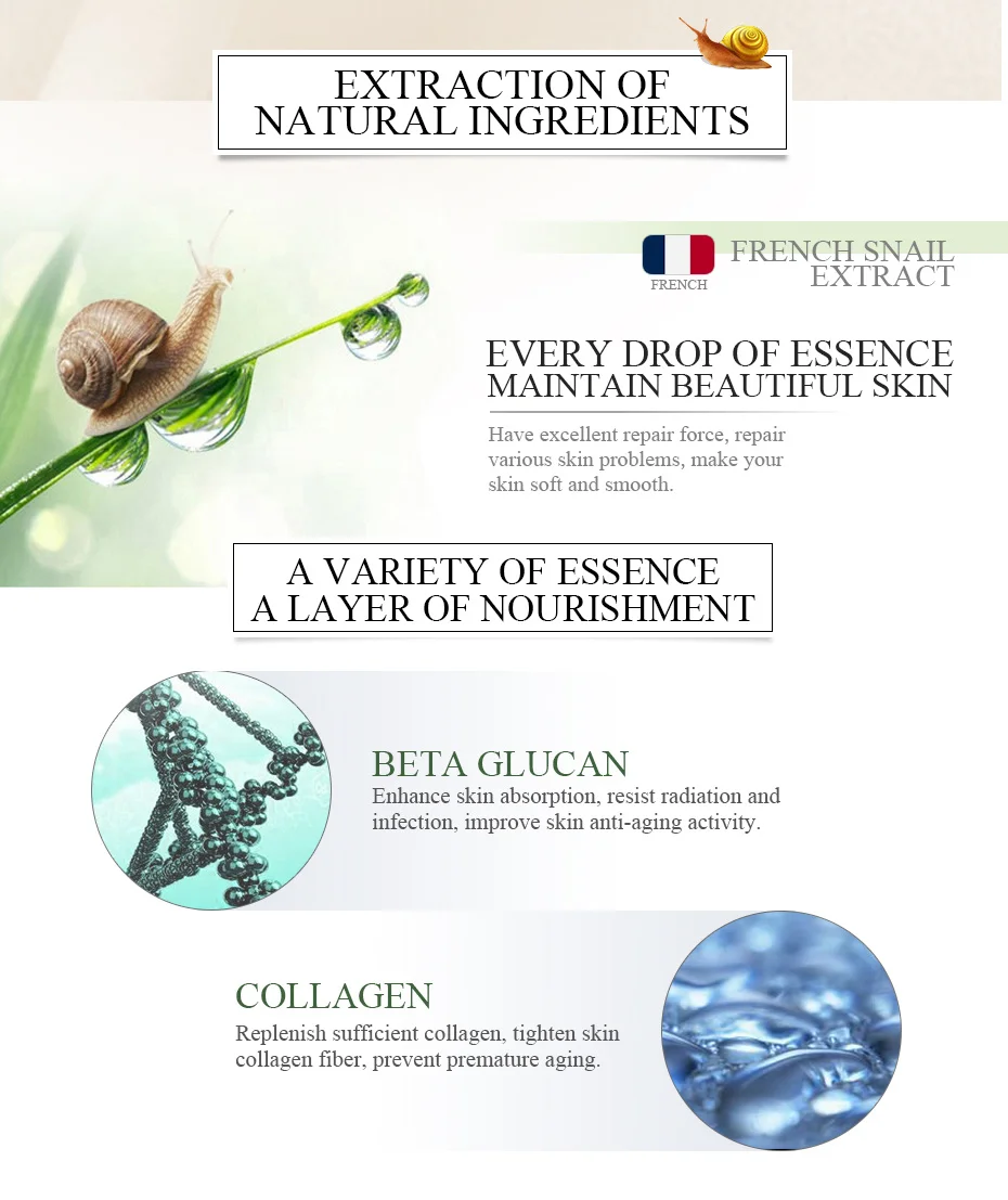 Экстракт каждой капли эссенции поддерживают Красивую Кожу обладают отличной восстанавливающей силой, восстанавливают различные проблемы кожи, делают вашу кожу мягкой и гладкой. Разнообразие эссенции слой питания бета глюкан: усиливают усвоение кожи, противостоят излучению и инфекции, улучшают кожную антивозрастную активность. COLI AGEN: восполняют достаточное количество коллагена, подтягивают коллагеновые волокна кожи, предотвращают преждевременное старение.