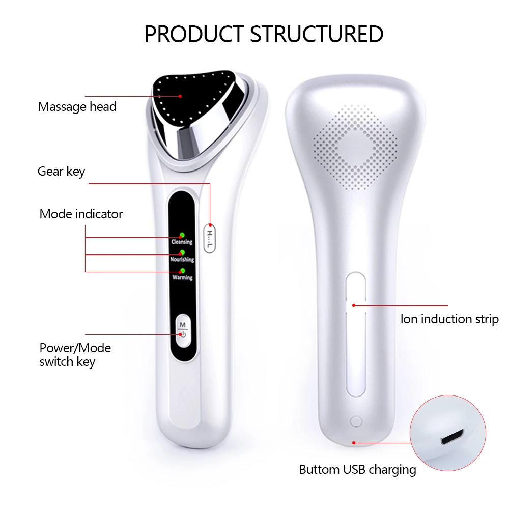 Материал: пластик Функция: ускорение внесения эссенции в кожу, разогрев, индукционный вибромассаж, снятие макияжа Режимы: очищение, питание, согревание Температура нагрева: около 42 ℃ 1. Бережная лихорадка при 42 °C способствует открытию пор, смягчению рогового слоя кожи, глубокому очищению; 2. 10000 вибраций высокой частоты в минуту + введение отрицательных ионов заставляют эссенцию средств по уходу за кожей проникать глубоко в кожу, чтобы помочь усвоению питательных веществ; 3. Постоянная температура +, вибрация + ион, используется с эссенцией, лосьоном и маской для лица для повышения упругости, массажа кожи, снятия усталости лица, эффективного введения и лучшего впитывающего эффекта. Мощность: 3,5 Вт Напряжение: 3,7 в Напоминание о времени: 4 минуты Режим загрузки: Длительное нажатие в течение 3 секунд Емкость аккумулятора: 300 мА Способ зарядки: USB-кабель Примечание: Вибрация является индуктивной, головку нужно удалить с кожи, а серебристую полоску датчика зоны на задней части изделия необходимо удалить Размер игрушки: 15,8*5,5*4 см
