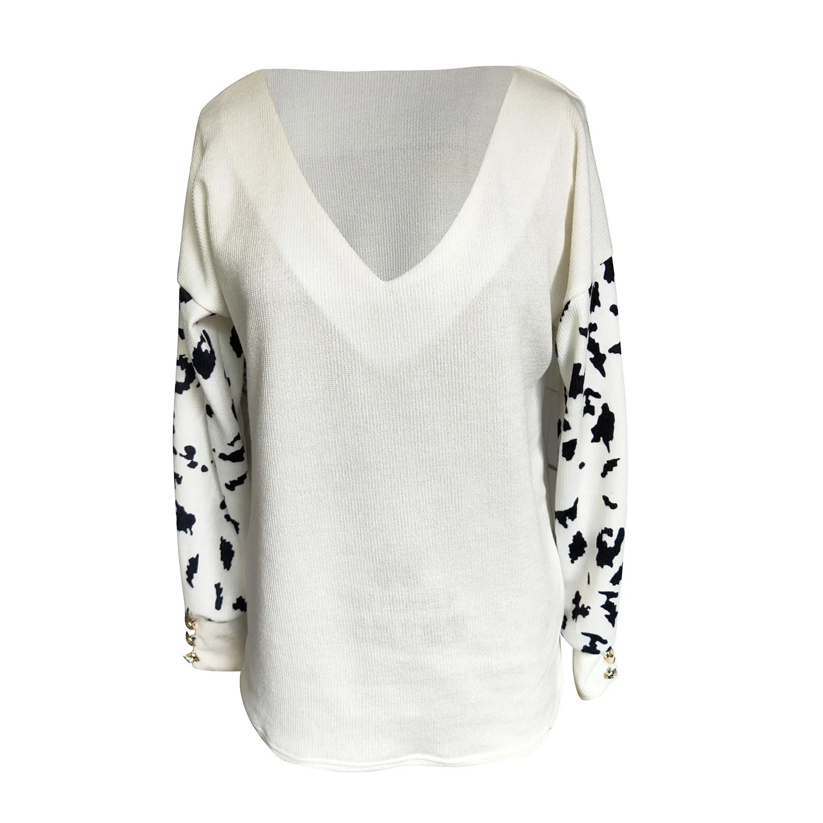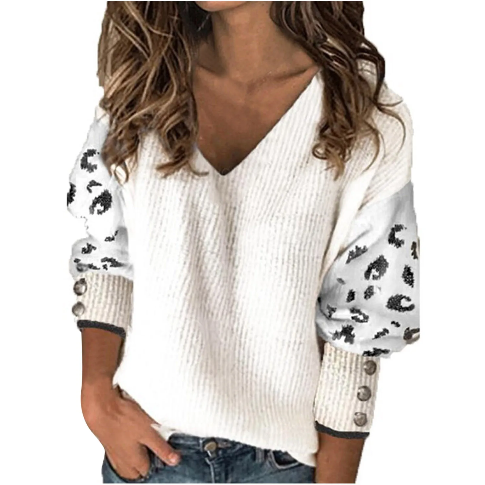 Женский Модный трикотажный свитер с длинными рукавами и V-образным вырезом, Леопардовый принт пэтчворк