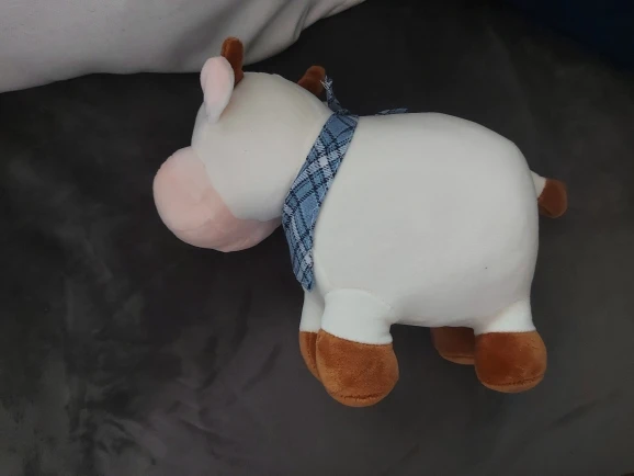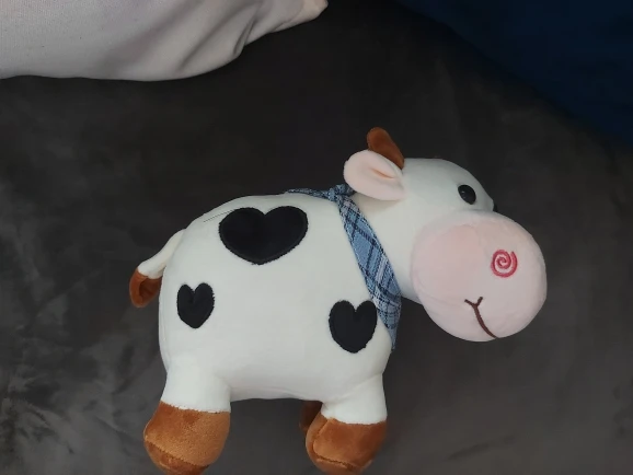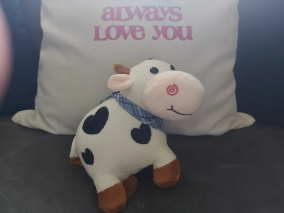 chegou dentro do prazo, gostei muito. Veio com um negócio para pendurar, e aguenta o peso dela, não cai. Comprei o menor tamanho, e achei um tamanho ótimo para decoração. Único fato e que o outro lado dela é liso, poderia ter umas manchinhas também, acho que ficaria ainda mais bonita a pelúcia de vaquinha. É super macio o tecido.