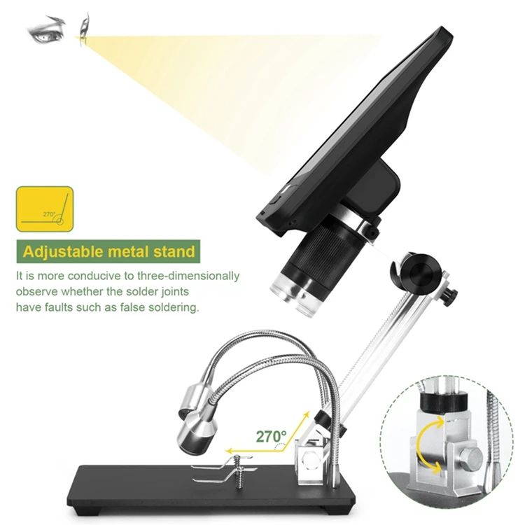 Продукт имеет 8,5 дюймовый ЖК-экран, который больше и отображает четче.Угол дисплея микроскопа можно отрегулировать для облегчения многоуглового наблюдения.Металлический кронштейн может быть отрегулирован спереди и сзади, что может привнести 3D визуальные эффекты и увеличить операционное пространство.Металлическая черная опорная пластина, с зажимом, может закрепить предмет наблюдения.В основание кронштейна добавлены 2 светодиодный ных лампы, в которых встроено 8 светодиодный ных ламп, что делает im-age более острым.Поддерживает карту памяти для записи и фотосъемки, что более удобно в использовании.Поддержка 12 языков: упрощенный китайский, традиционный китайский, английский, японский, французский, немецкий, корейский, португальский, испанский, русский, тайский, вьетнамский.Изделия широко используются: повторная пара электронных изделий, таких как мобильные телефоны и компьютеры, идентификация анти-кник, печатная продукция, текстиль, ювелирные изделия, фабричные производственные линии, ценовые пары, наблюдение за растениями и в секте и т. д.Датчик изображения: 2 Мегапикселя HD СенсорРазрешение видео: FHD 1920x1080 30FPS; 1080P 1440x1080 30FPS;720P 1280x720 30FPS;Формат видео: AVIУвеличение: 5X-260XРазрешение фотографий: Макс. 12 м (4032x3024)Формат фотографии: JPGДиапазон фокусировки: 1 см-16 смЧастота кадров: Макс 30f/sХранение: карта Micro-SD, до 32G (не входит в комплект)Поддержка ПК: нетИсточник питания: USB 5V DCИсточник светильник: два встроенных светодиодаРазмер подставки: 20 см * 12 см * 19 смРазмер экрана: 8,5 дюймаРазрешение экрана: 1280*800Поддержка языков: 12 типов, упрощенный китайский/традиционный китайский/английский/японский/французский/немецкий/Корейский/Португальский/Испанский/русский/тайский/вьетнамскийСертификация: CE/FCC/ROHS