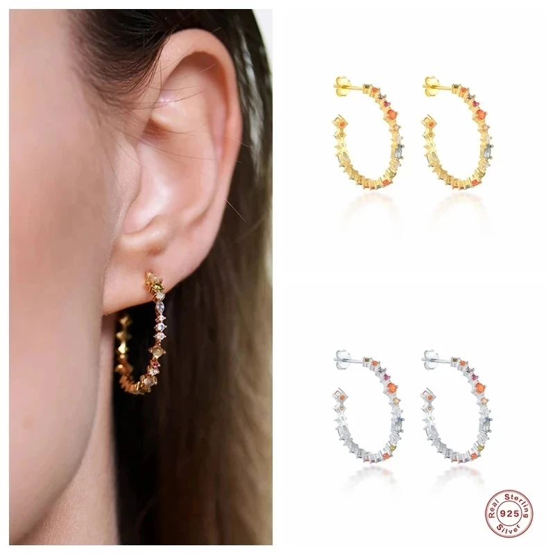 GS 925 стерлингового серебра, украшенные разноцветными кристаллами круг серьги в виде колец, Радуга Циркон C Форма Пирсинг Серьга для женщин класса люкс, ювелирное изделие, подарок