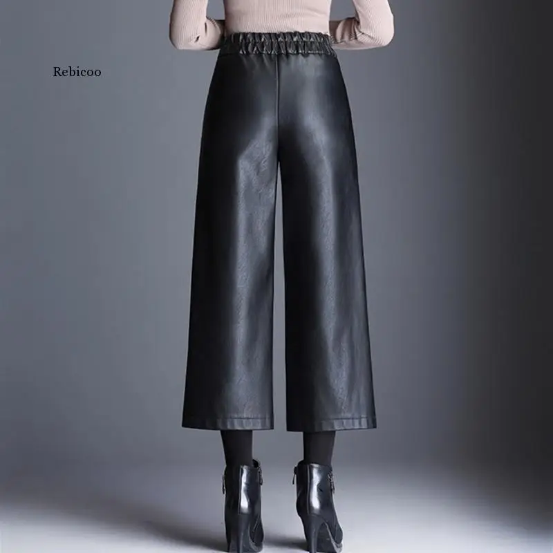 Женские брюки до щиколотки из искусственной кожи, мешковатые черные свободные брюки с высокой талией и широкими штанинами, размера плюс
