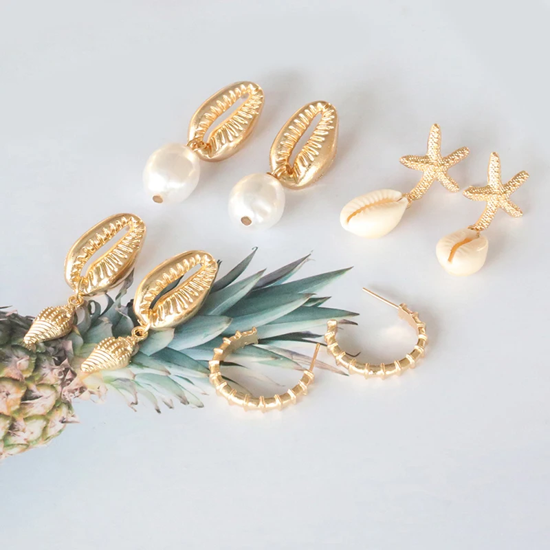 4 пары/1 комплект, золотые висячие серьги в стиле бохо с морской звездой и жемчугом, висячие серьги для женщин, пляжные серьги для пирсинга, подарок