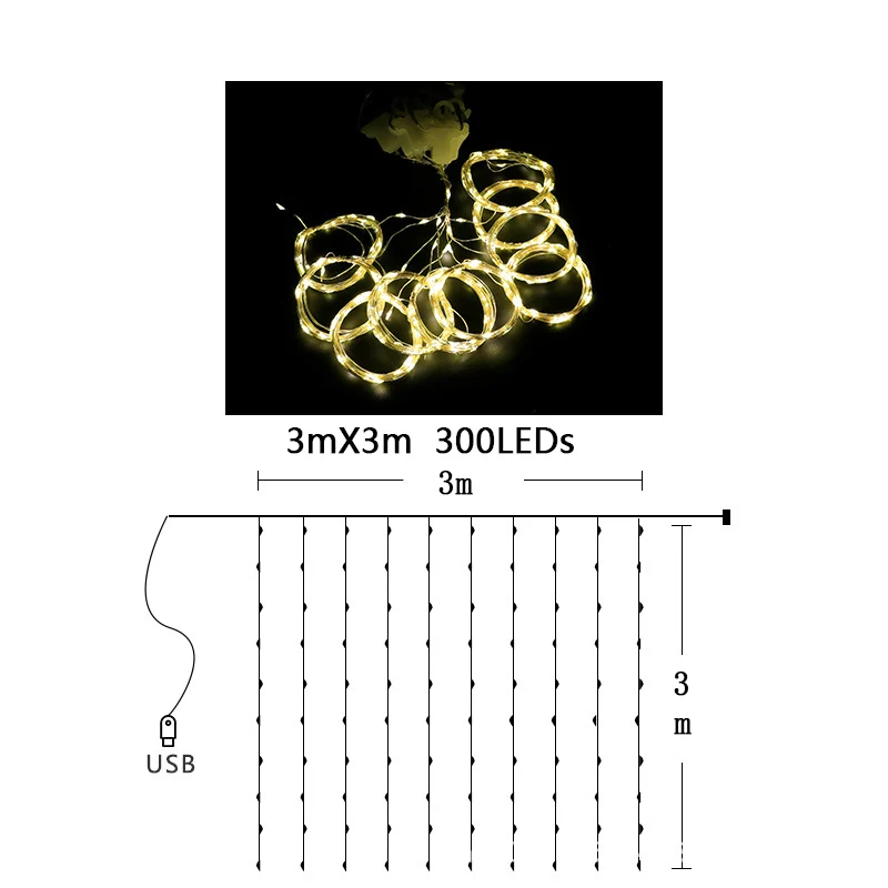 Материал: пластик + серебряная медная проволока Размер: 3*3 м с 300 светодиодами 3*2 м с 200 светодиодами 3*1 м со 100 светодиодами Водонепроницаемость: IP44 Питание от: USB Светильник источник света: светодиодный Светодиодный Количество: 100 / 200 / 300 светодиодный s Светодиодный цвет: теплый белый/многоцветный Срок службы: 50000 часов Переключатель 8 режимов: на USB или пульте дистанционного управления Длина 3 метра, высота 1 м/2 м/3 м на выбор Характеристика: 1. Продукт низкого давления, светильник, шнур, лампа не протекает, струна водонепроницаемая 2 лампы не нагреваются, не нагреваются, могут быть тронуты 3. Безопасная, высокая гибкость, простота и быстрая работа 4. Низкая температура, долгий срок службы, 360 градусов освещения, низкая потребеление энергии 5. Продукт небольшой по размеру, светильник по весу, принимает логистику и доставку. 6,8 режимы: Комбинация; В волнах; Последовательный; Медленное свечение; Чеканка; Выцветание; Вспышка; Устойчивый Посылка: Гирлянда для штор * 1 1X пульт дистанционного управления (батарея в комплект не входит)
