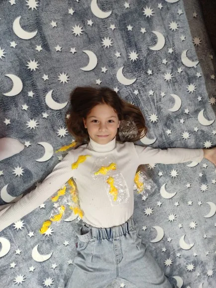 ребенок в восторге. лежит уже 3 недели. в местах где светится, начали появляться катышки. в целом очень приятный вариант и его не жалко совершенно