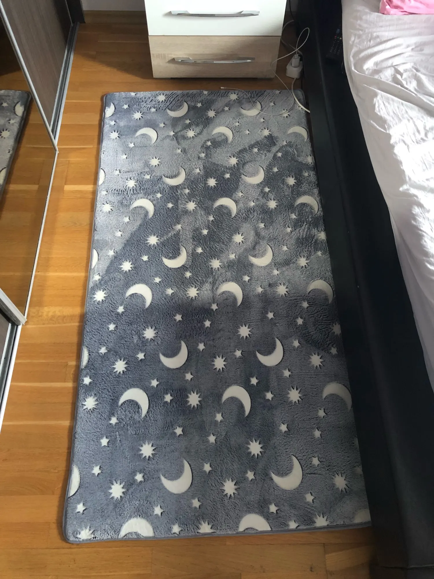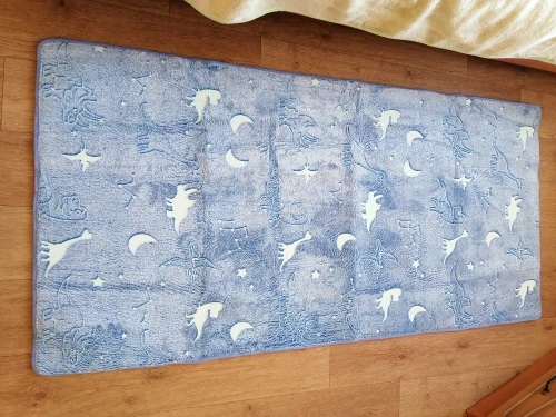 Коврик очень мягкий, почти как плюшевый плед, нам очень понравился. Наступаешь и слегка проваливаешься, ночью рисунок светится. Заказала ещё один для дочери в комнату. Доставка нормальная, спасибо продавцу за отличный товар!