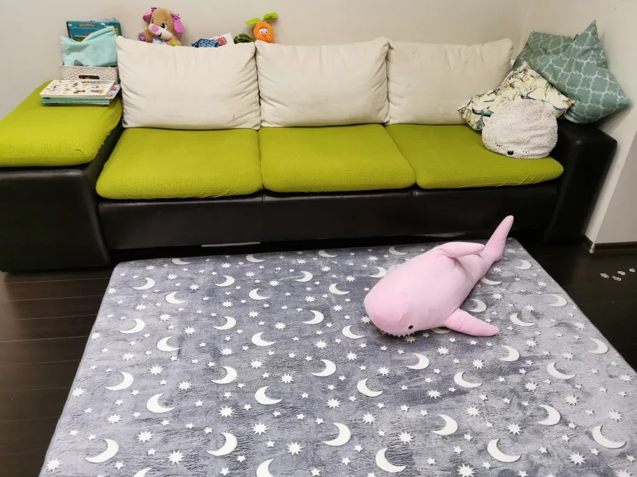 Очень мягкий ковёр и красиво светится в темноте. Если свет падает даже на угол ковра, то он не светится.