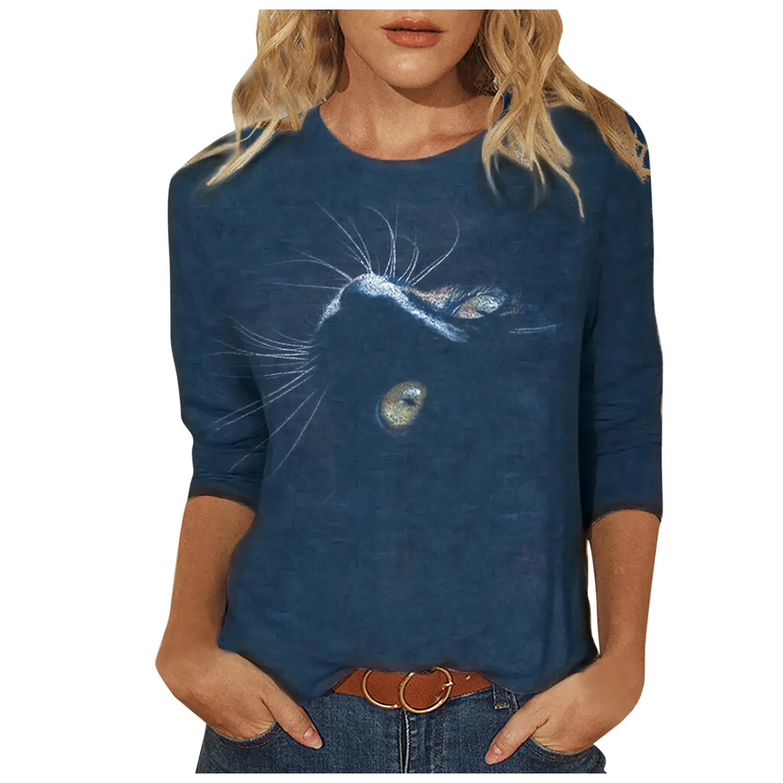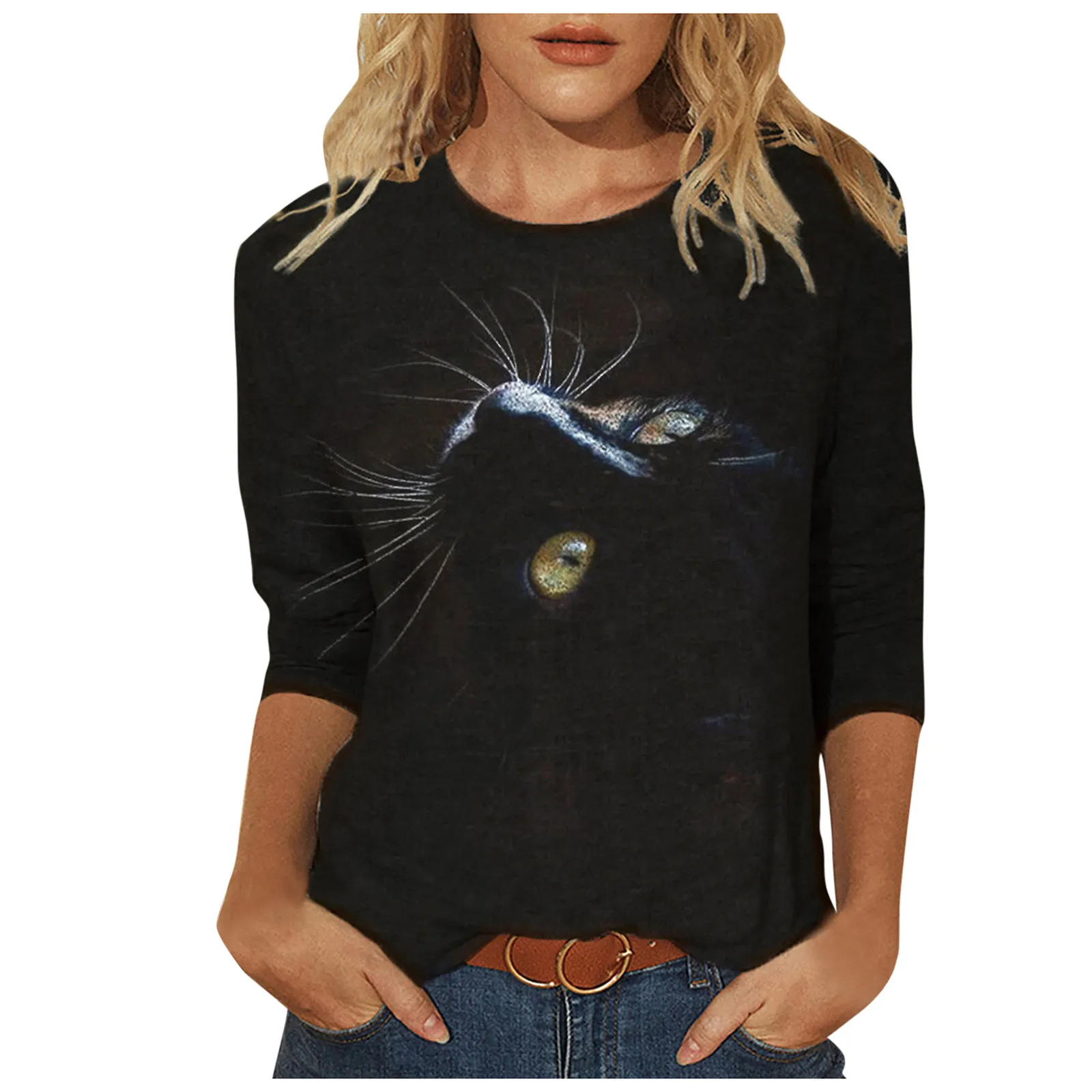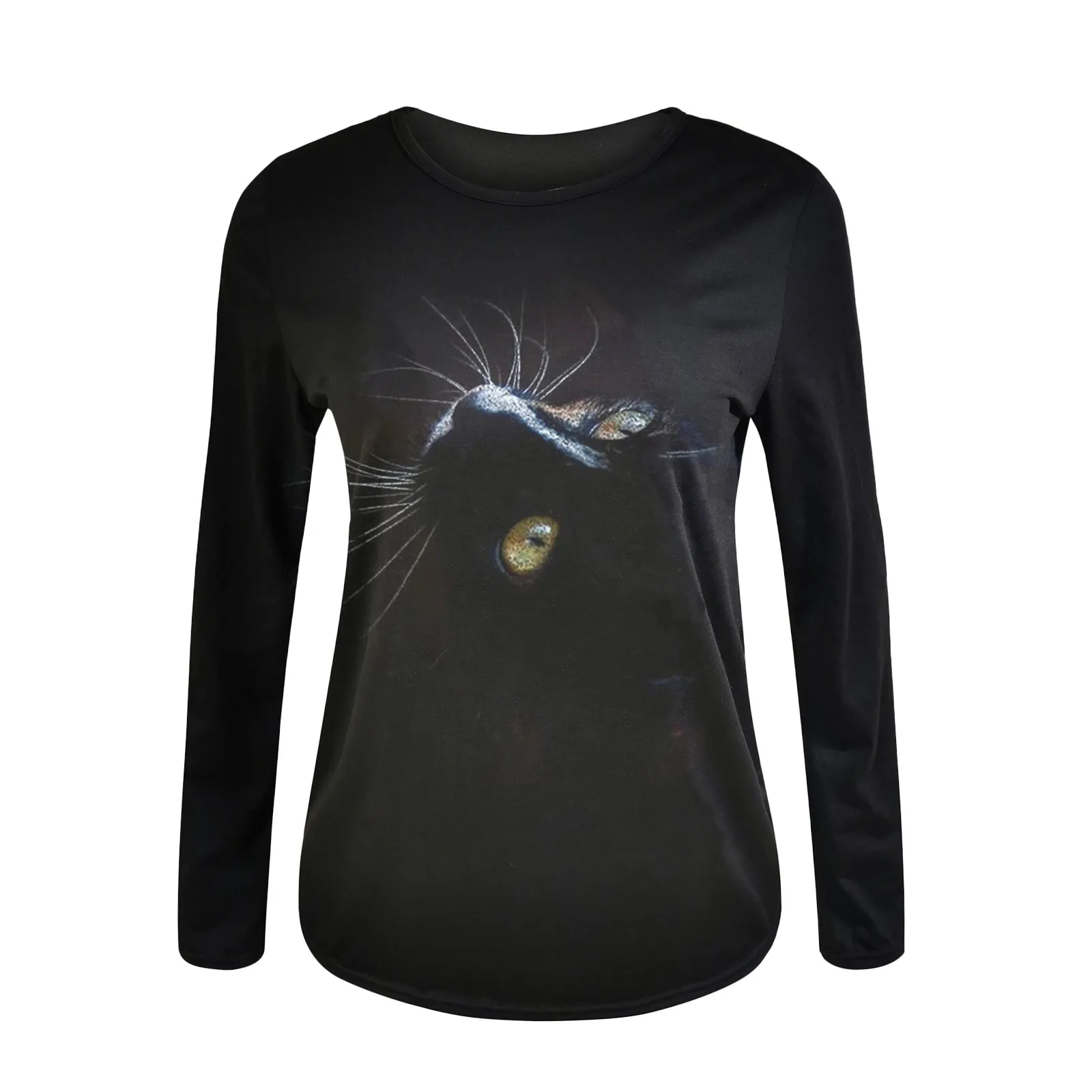 Блузка Женская с длинным рукавом, Повседневная рубашка с круглым вырезом и принтом кошки, чистый черный топ
