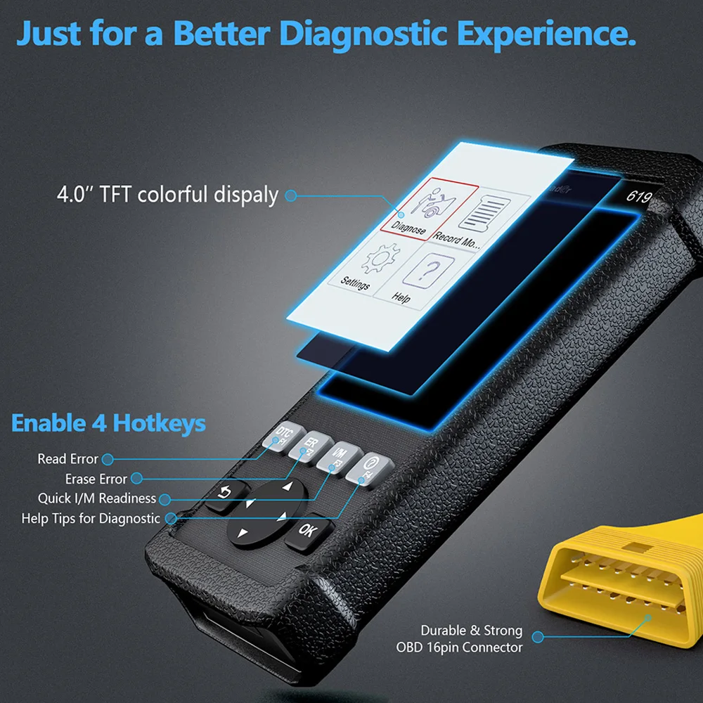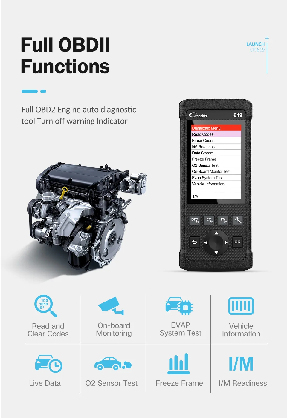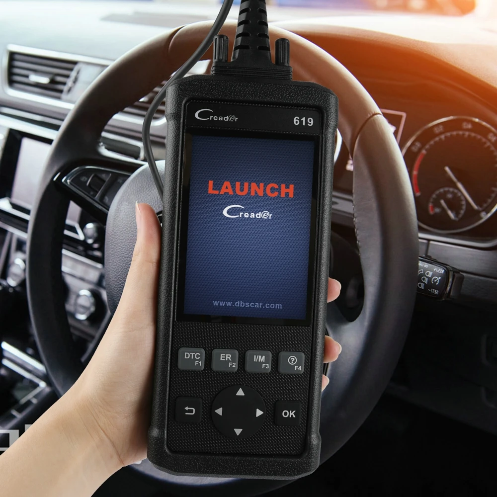 Launch X431 Creader CR619 сканер, может читать, очистить DTCs (код ошибки) в автомобиле ABS и SRS Подушки безопасности. Помогает определить проблемы с автомобилем, а также встроенный диагностический модуль OBD2, может считывать поток данных в реальном времени на диаграмме и делать автомобильную диагностику удобной.