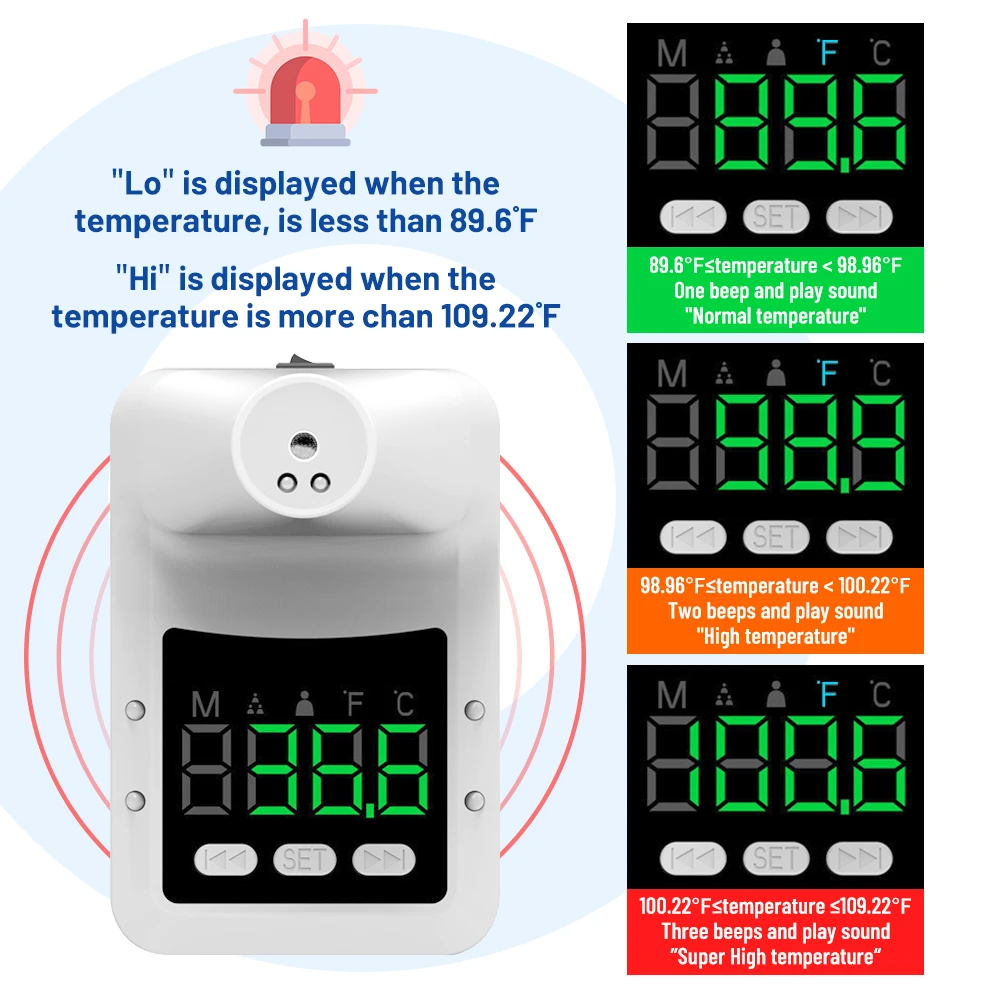 6. При измерении температуры будет голосовое уведомление. Нормальный: Один звуковой сигнал и нормальная температура, немного высокий: Два звуковых сигнала и высокая температура, очень высокий: три звуковых сигнала и сверхвысокая температура.
