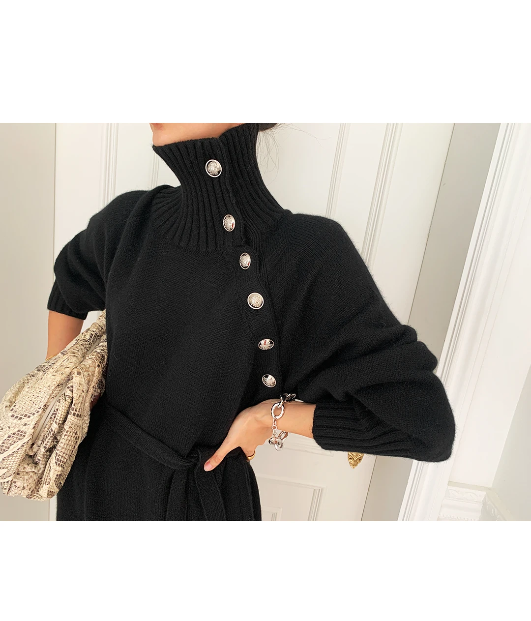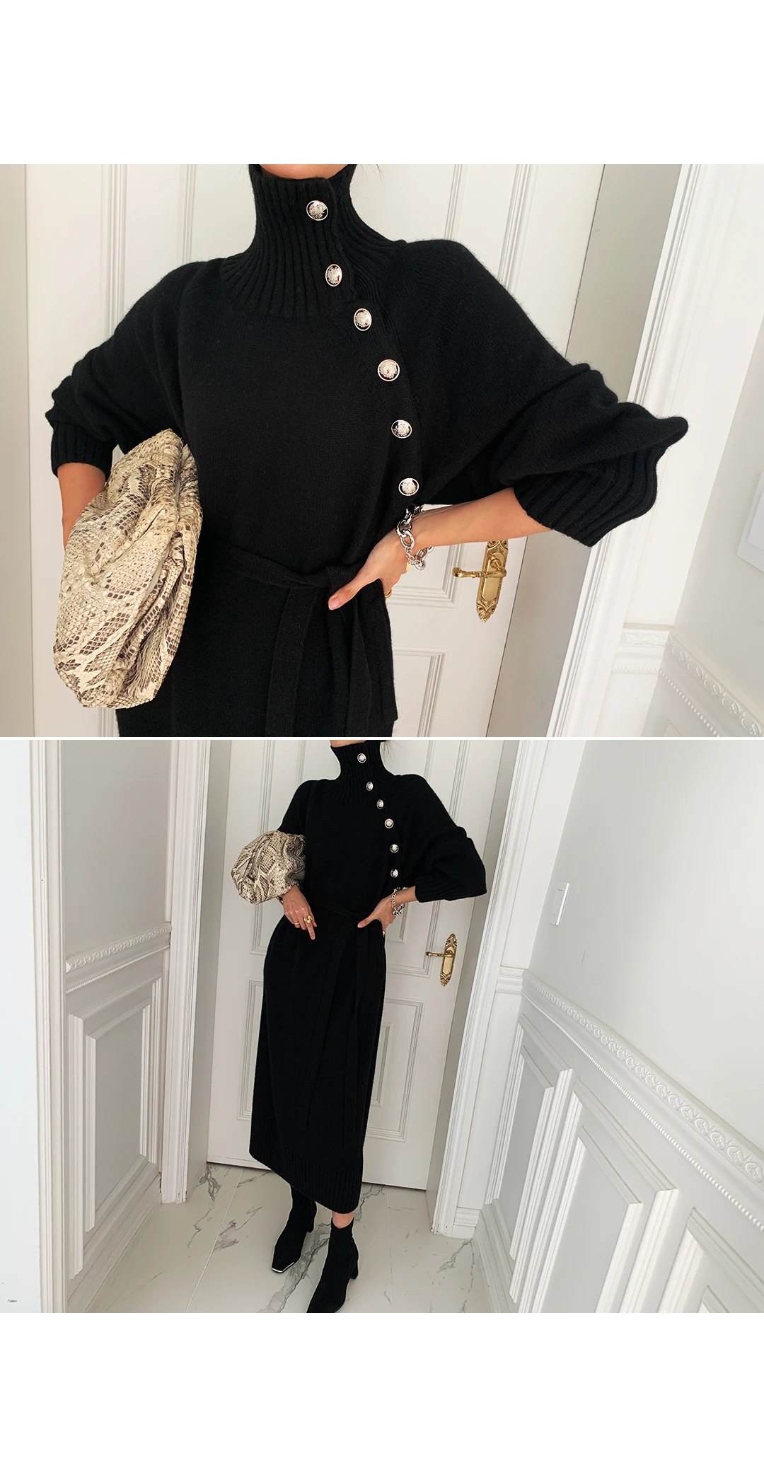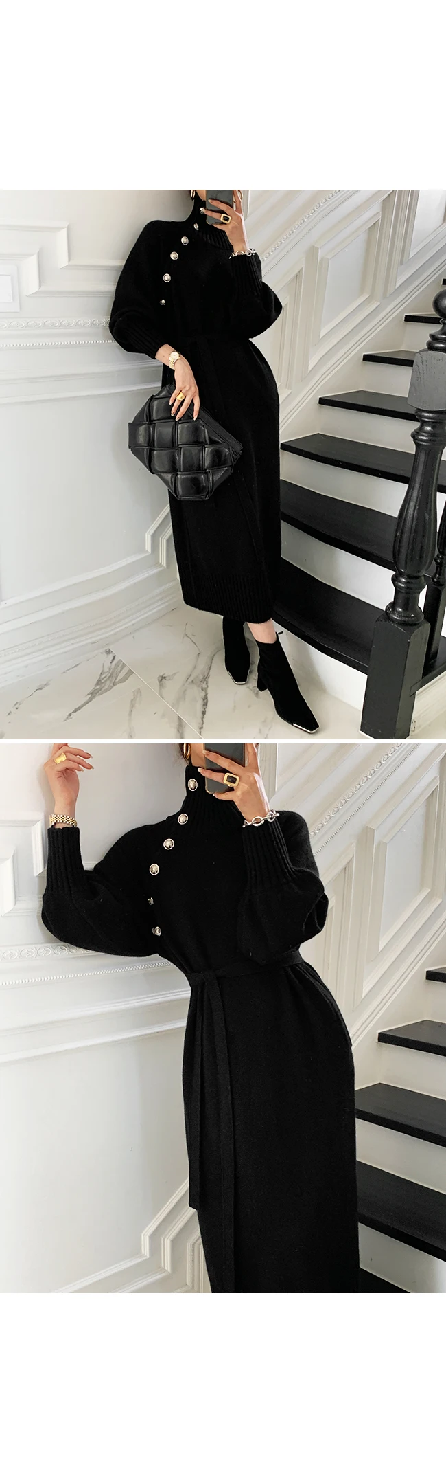 Женские вязаные платья-свитера SMTHMA, зимние теплые платья средней длины с высоким воротником и пуговицами, элегантные длинные платья на шнуровке