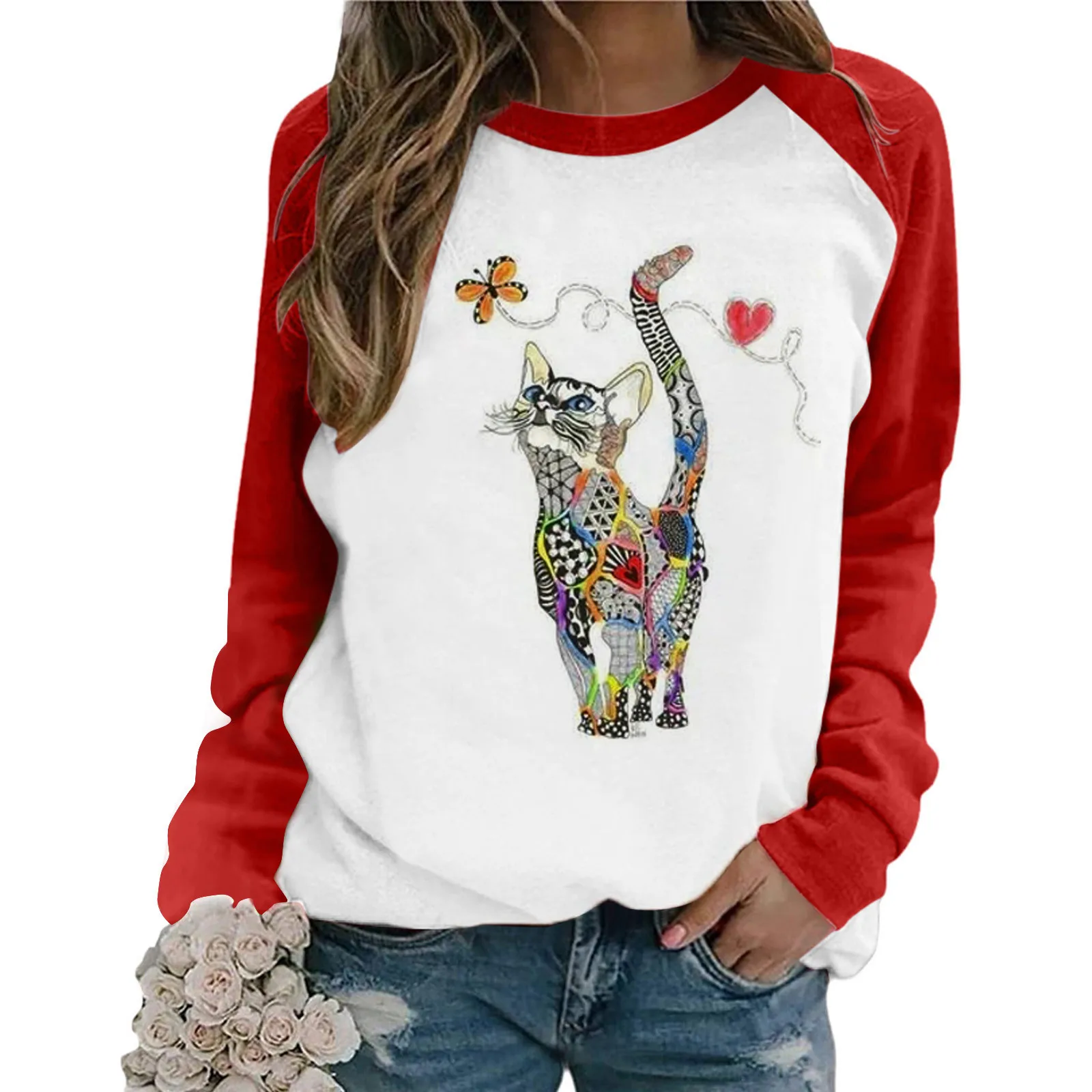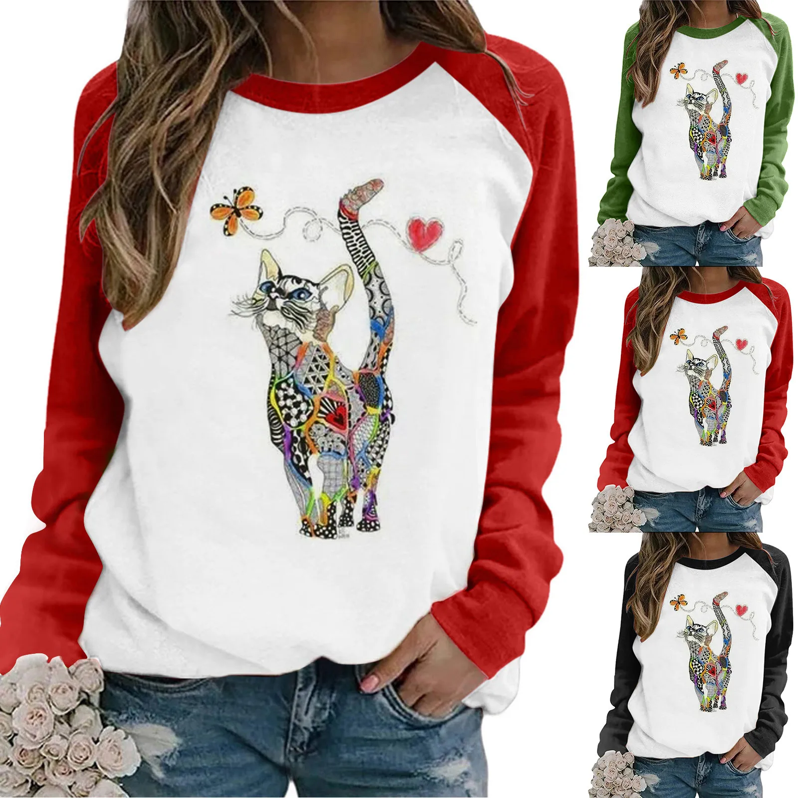 Женская Повседневная рубашка с длинным рукавом с принтом кота реглан