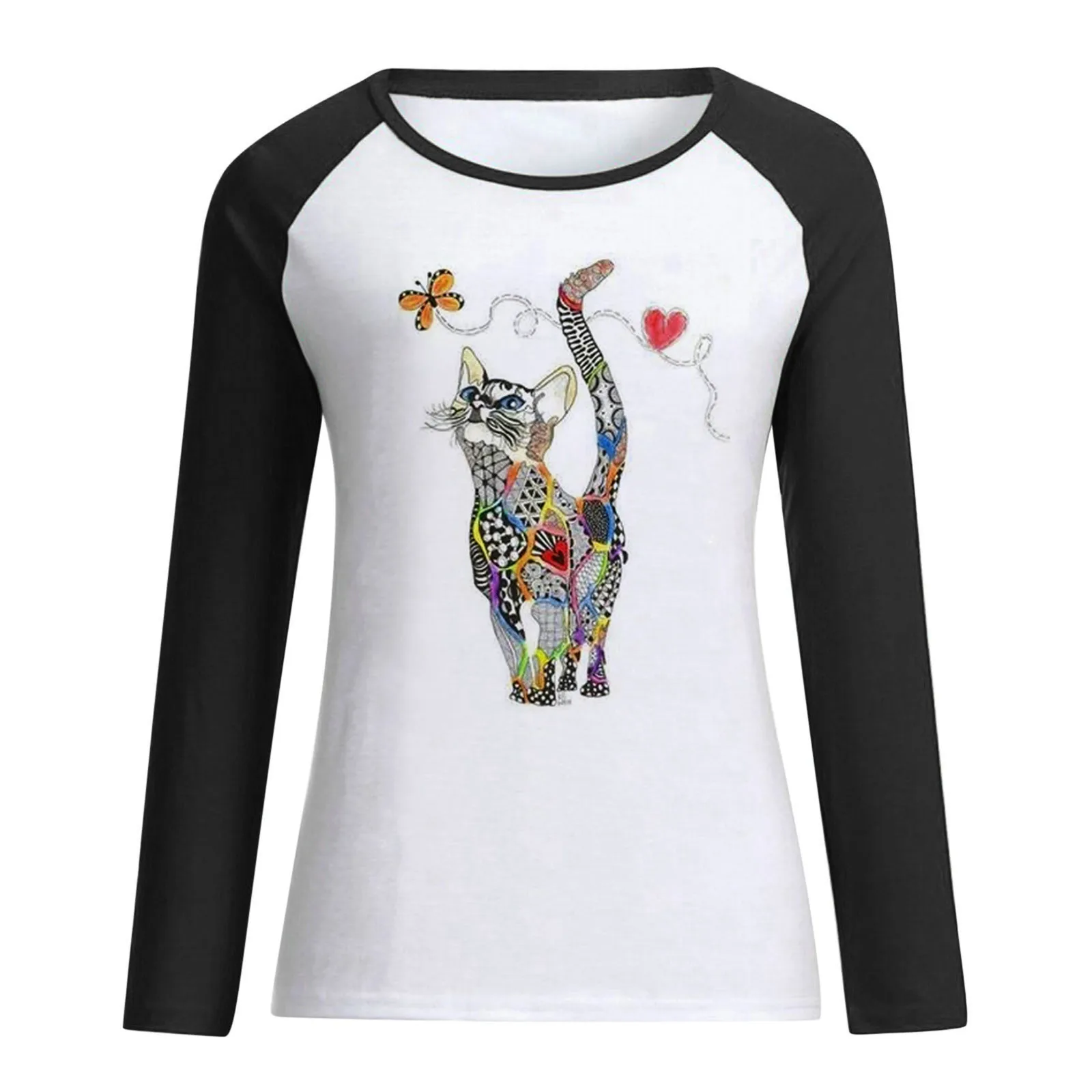 Женские рубашки в стиле Харадзюку, повседневные рубашки с длинным рукавом и мультяшным принтом кота реглан, топы, Весенняя Повседневная Элегантная футболка, ЛКИ оверсайс