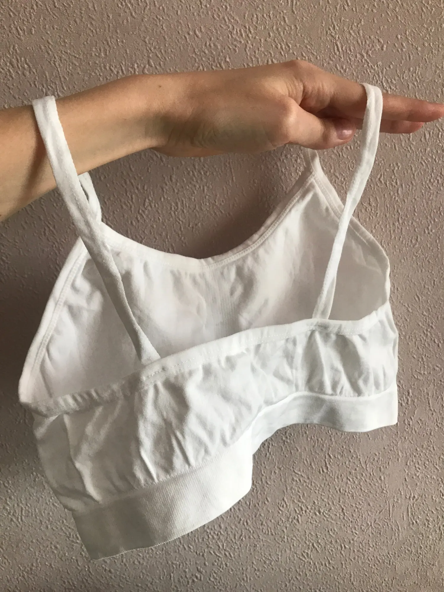 У белого топа ткань тонкая. Ожидала что он будет плотным и утягивающим чтобы надеть на йогу, а так только дома носить - соски торчат и просвечивают, зато удобный, напоминает топ для маленьких девочек))))) Ничего эта резинка полукруглая под грудью не держит, она лишь для декора. Сидит нормально, ношу XS, брала размер M за 200 руб. У цветного белья качество должно быть получше