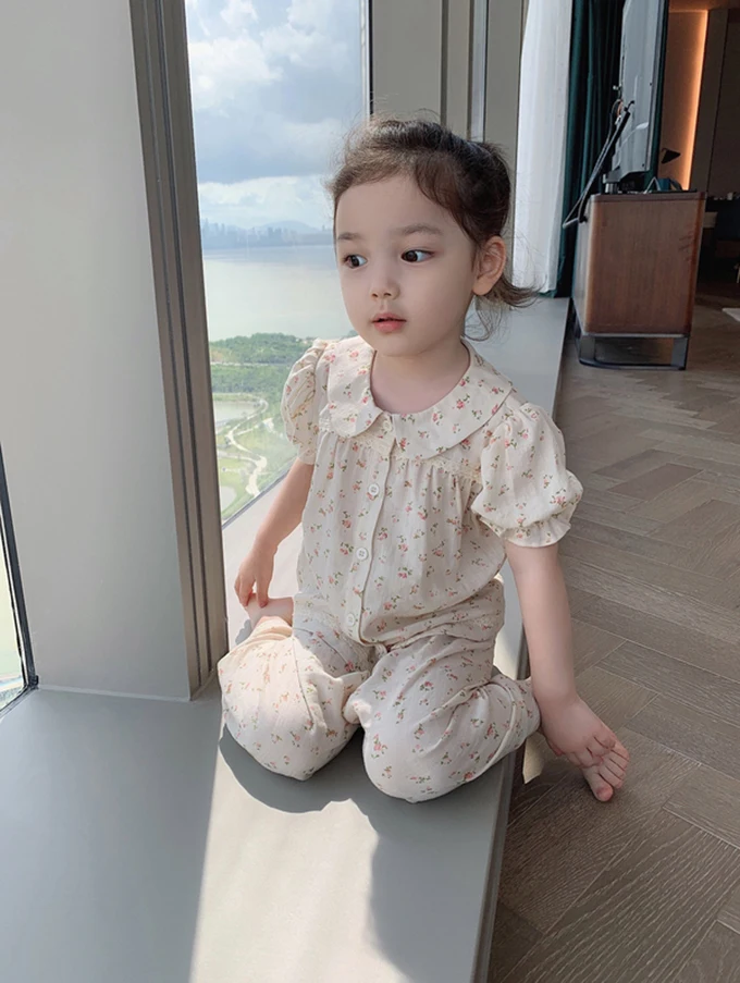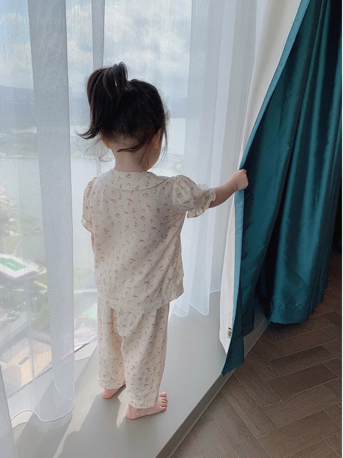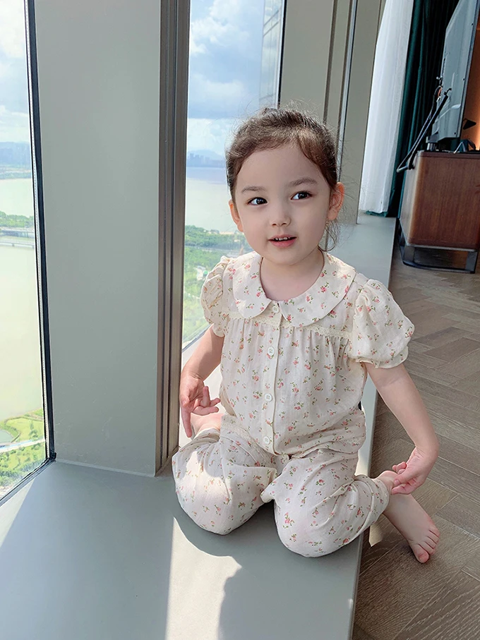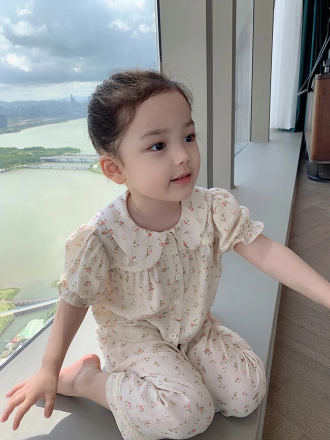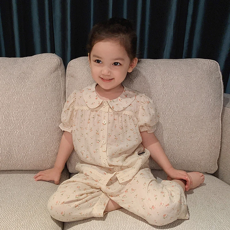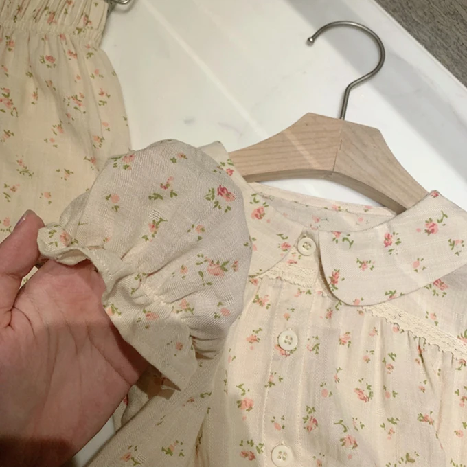 Детские пижамные комплекты с отложным воротником для девочек, винтажный пижамный комплект с цветочным рисунком и пышными рукавами для малышей, одежда для сна, детская одежда